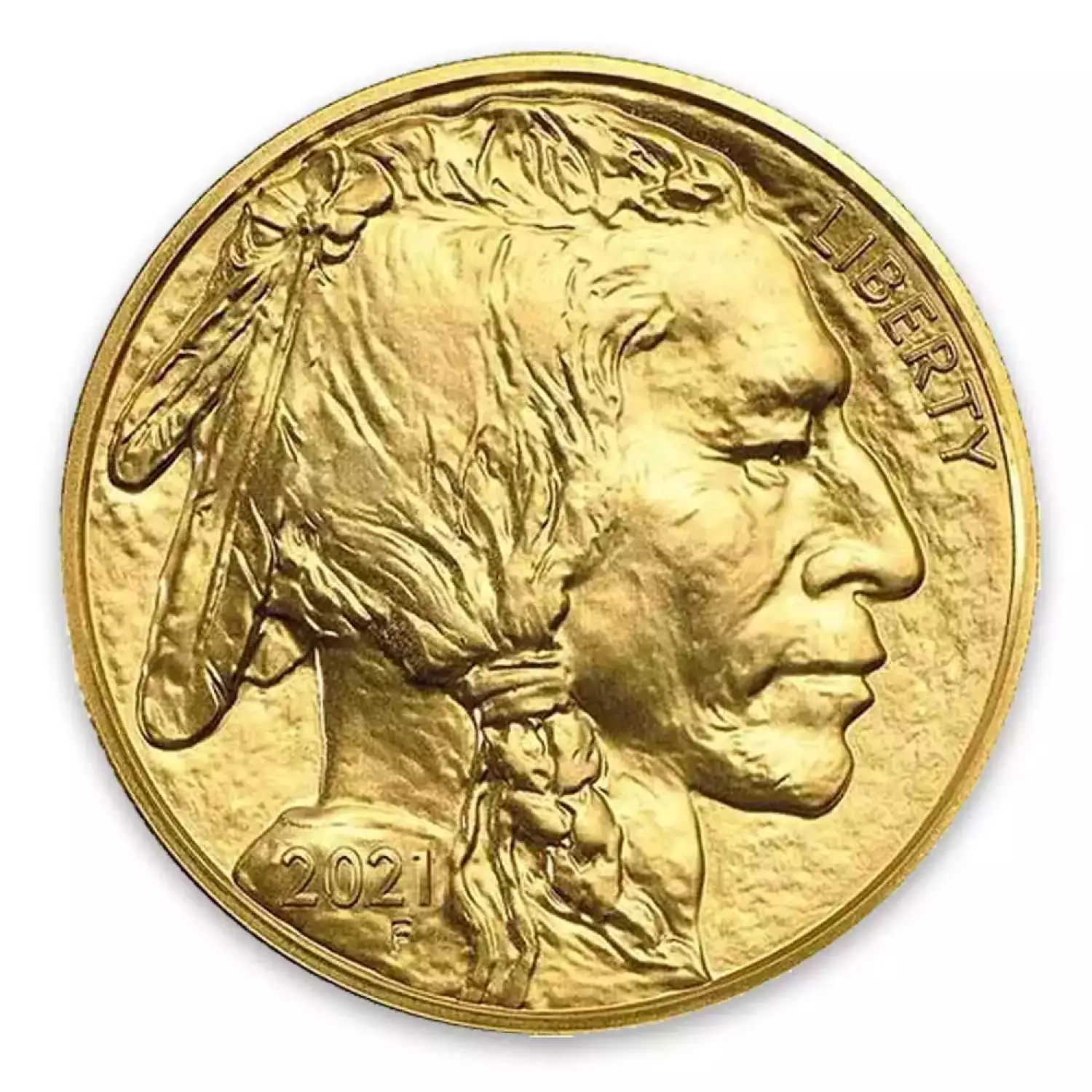 The 2021 Gold Buffalo Coin was the first coin struck by the US Mint that is composed of 1 troy ounce of 999.9 gold. What the 999.9 (sometimes simply shown as 9999 or .9999) stands for is the millesimal fineness scale where the gold buffalo coin is guaranteed to be a minimum of 999.9/1000 pure gold. Expressed another way, the gold coin is a minimum of 99.99% gold. The American Gold Buffalo started to be produced by the US Mint in 2008 in order to provide the market with a pure gold coin that would compete with other popular gold coins such as the Canadian Gold Maple Leaf or the Austrian Gold Philharmonic. Some investors prefer both the look and feel of pure gold coins versus the Krugerrand or American Gold Eagle, which are alloyed with other metals making them 22kt (9167 fineness). The American Gold Buffalo has one of the most interesting, identifiable, and iconic designs of any gold coin.
