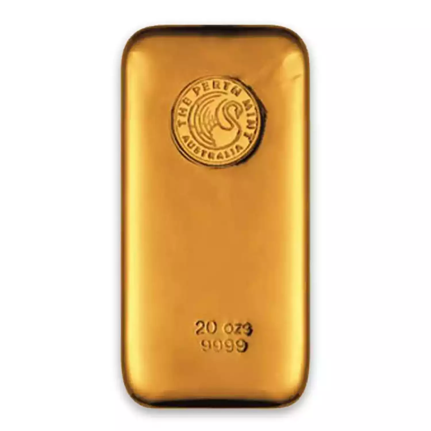 Each 20oz Australian Perth Mint gold bar - cast contains 20 troy ounces of .9999 fine gold. A 20oz Australian Perth Mint gold bar - cast is a very efficient investment in gold bullion.