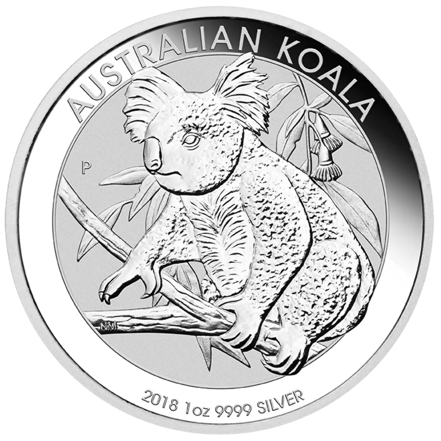 The spot price of silver tends to be more volatile than the spot price of gold and is one of the reasons that both silver premiums and spreads tend to be wider for silver coins and silver bars. Each 2018 1oz Australian Silver Koala is composed of 1 troy ounce of .9999 fine silver and has a limited mintage of 3,00,000 coins. The Obverse of the coin features Ian Rank-Broadley likeness of Her Majesty Queen Elizabeth II. The reverse of each coin portrays a koala sitting on the branch of a eucalyptus tree surrounded by gum leaves. The inscription AUSTRALIAN KOALA, The Perth Mint’s traditional ‘P’ mintmark, the 2018 year-date, and the weight and purity are also included in the design