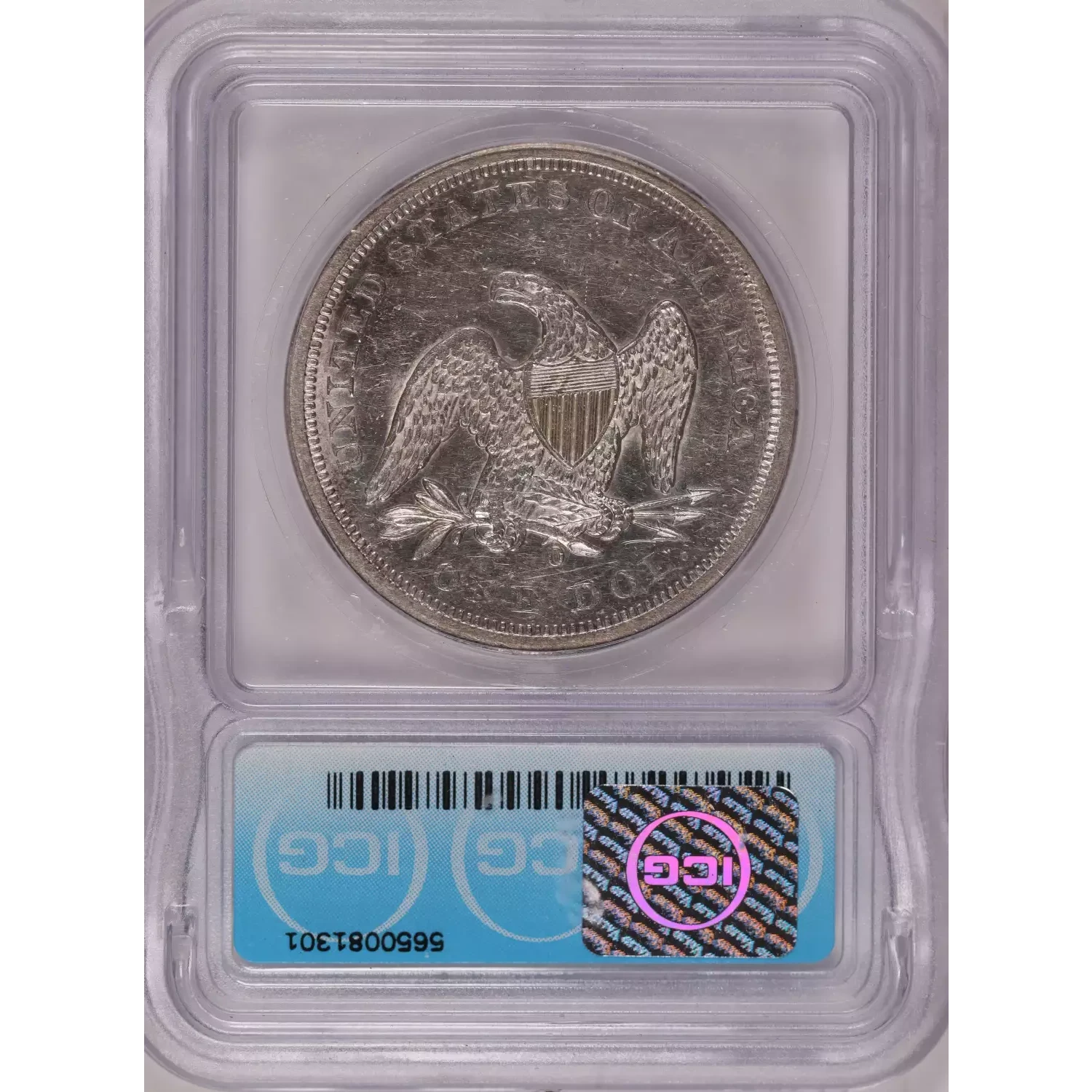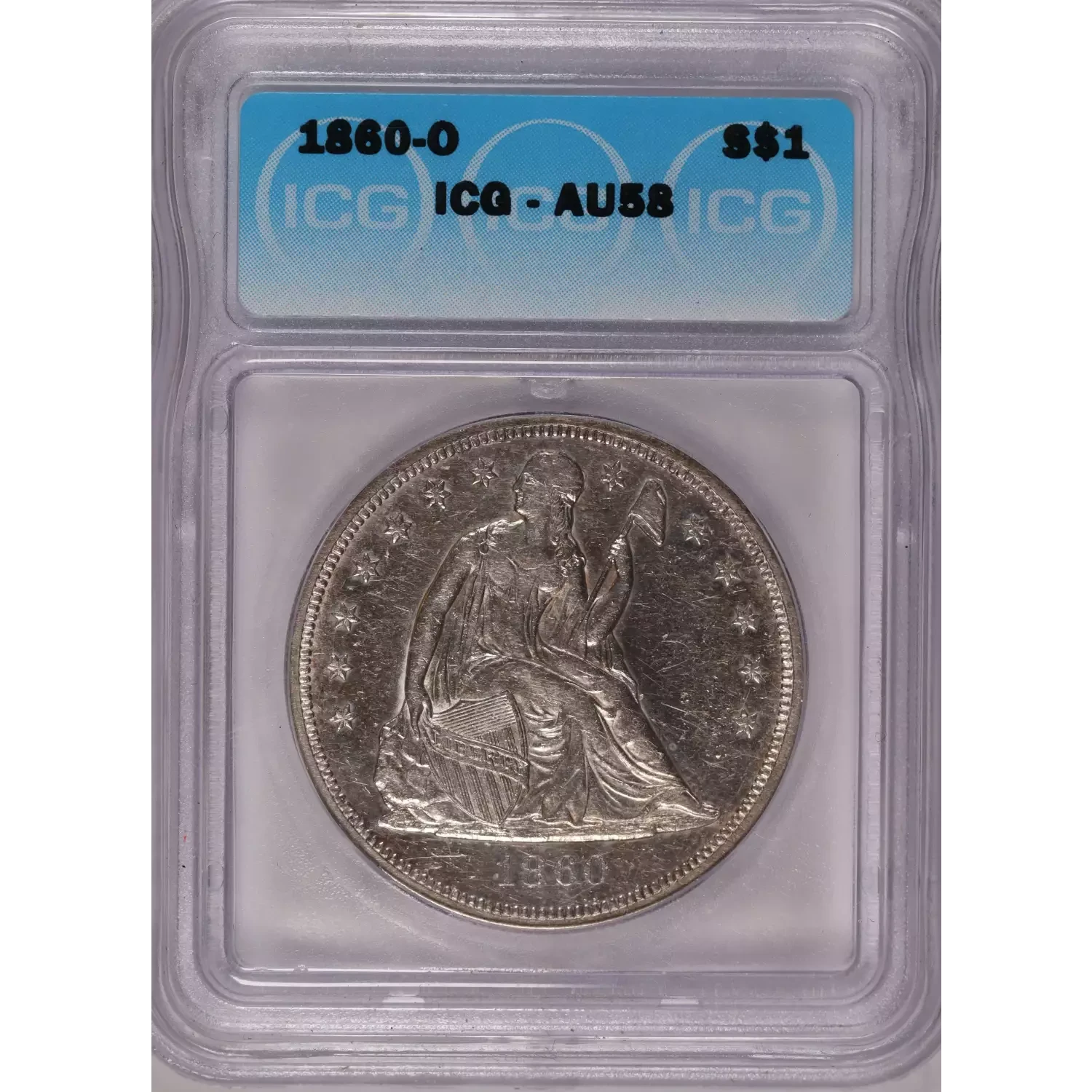 1860-O SEATED LIBERTY DOLLAR ICG AU58