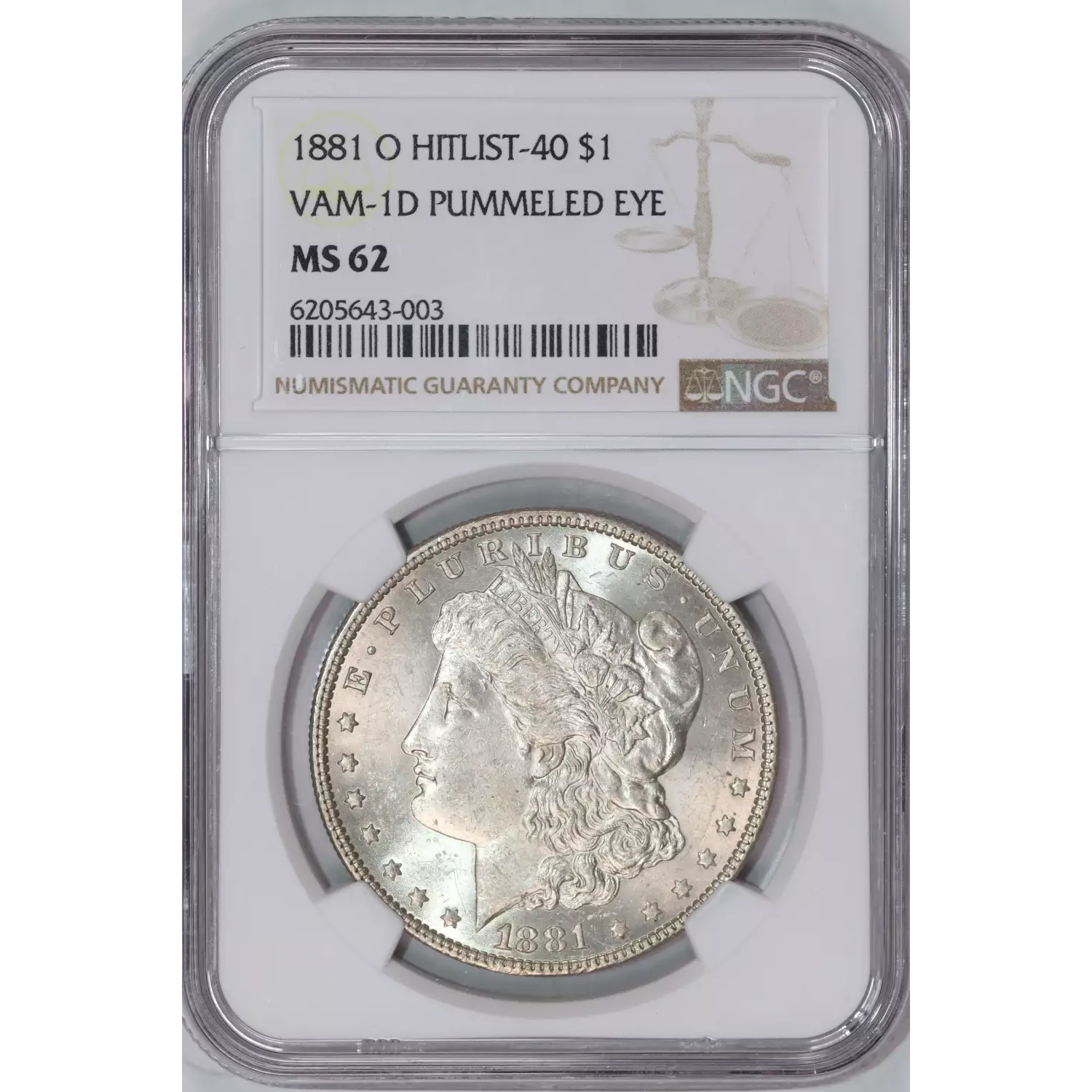 1881-O VAM-1D MORGAN DOLLAR "PUMMELED EYE" HIT LIST 40 NGC MS62