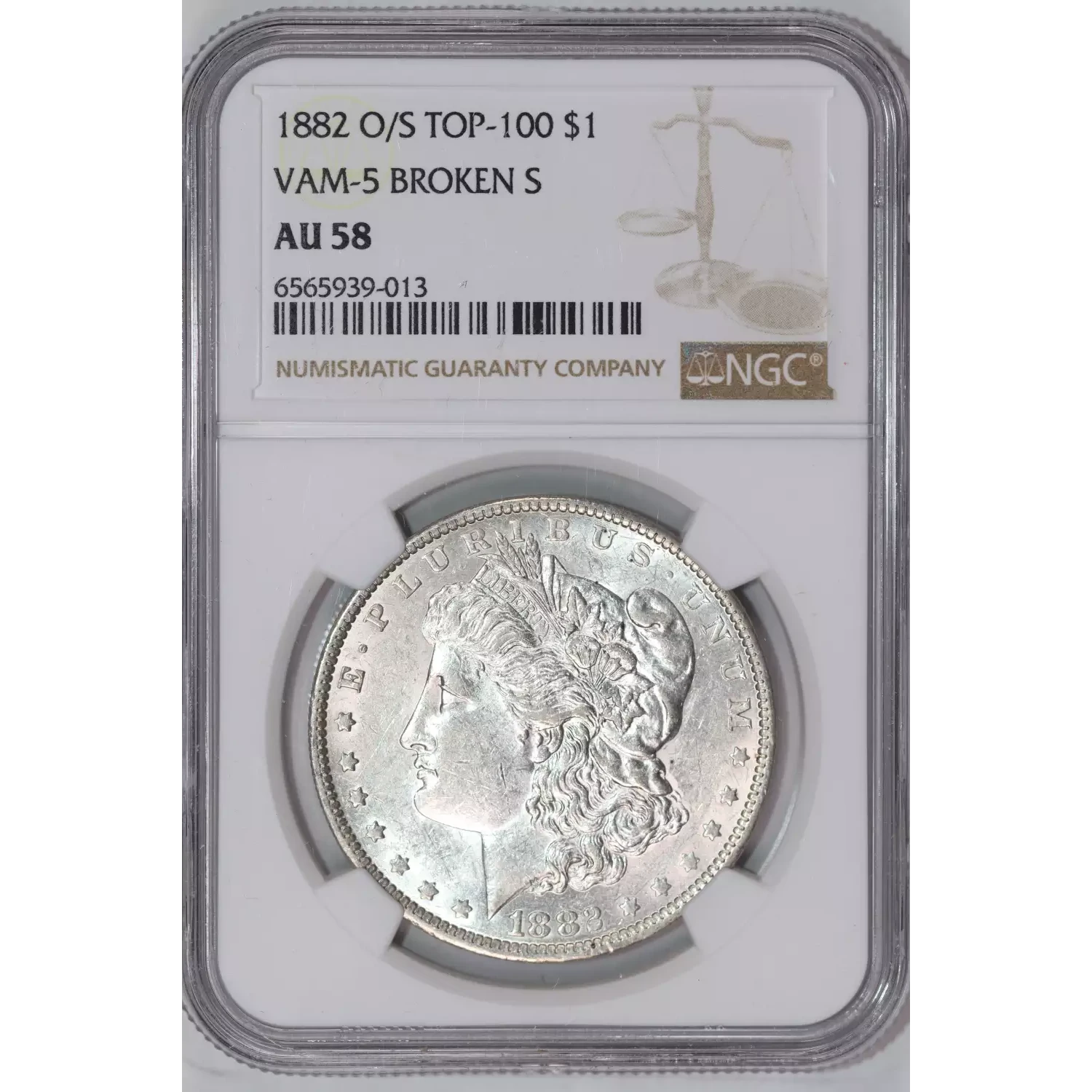 1882 O/S VAM-5 "BROKEN S" TOP 100 MORGAN DOLLAR NGC AU58