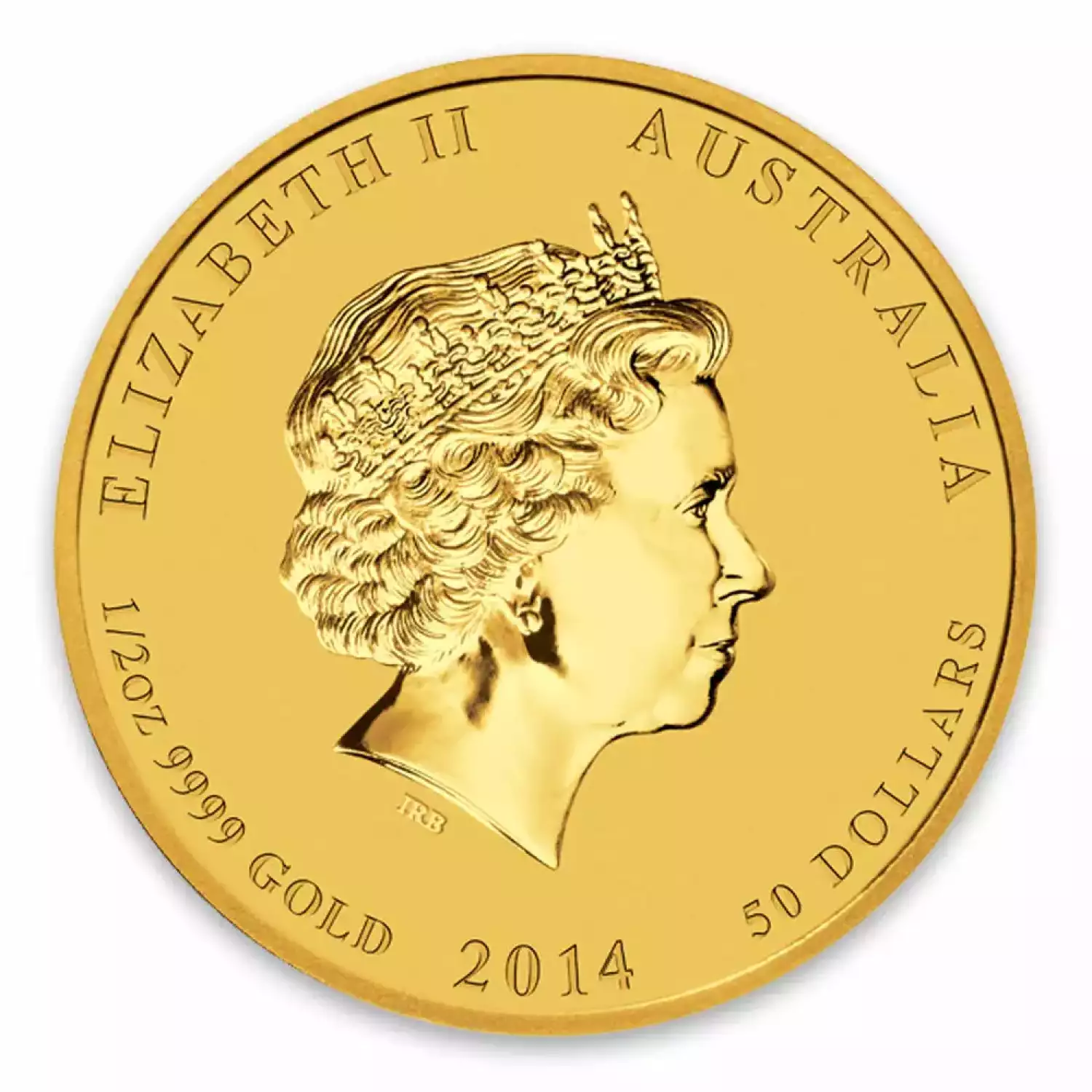 Each 2014 1/2 oz Australian Perth Mint Gold Lunar II: Year of the Horse is composed of 1/2 troy ounce of .9999 fine gold bullion. This bullion coin has a face value of 50 AUD and is guaranteed by the Australian government.