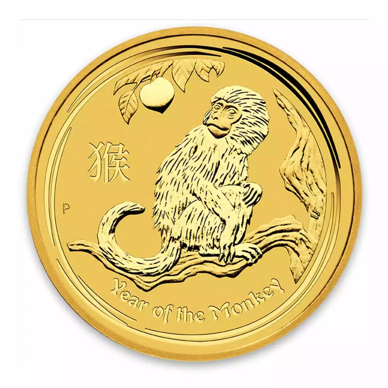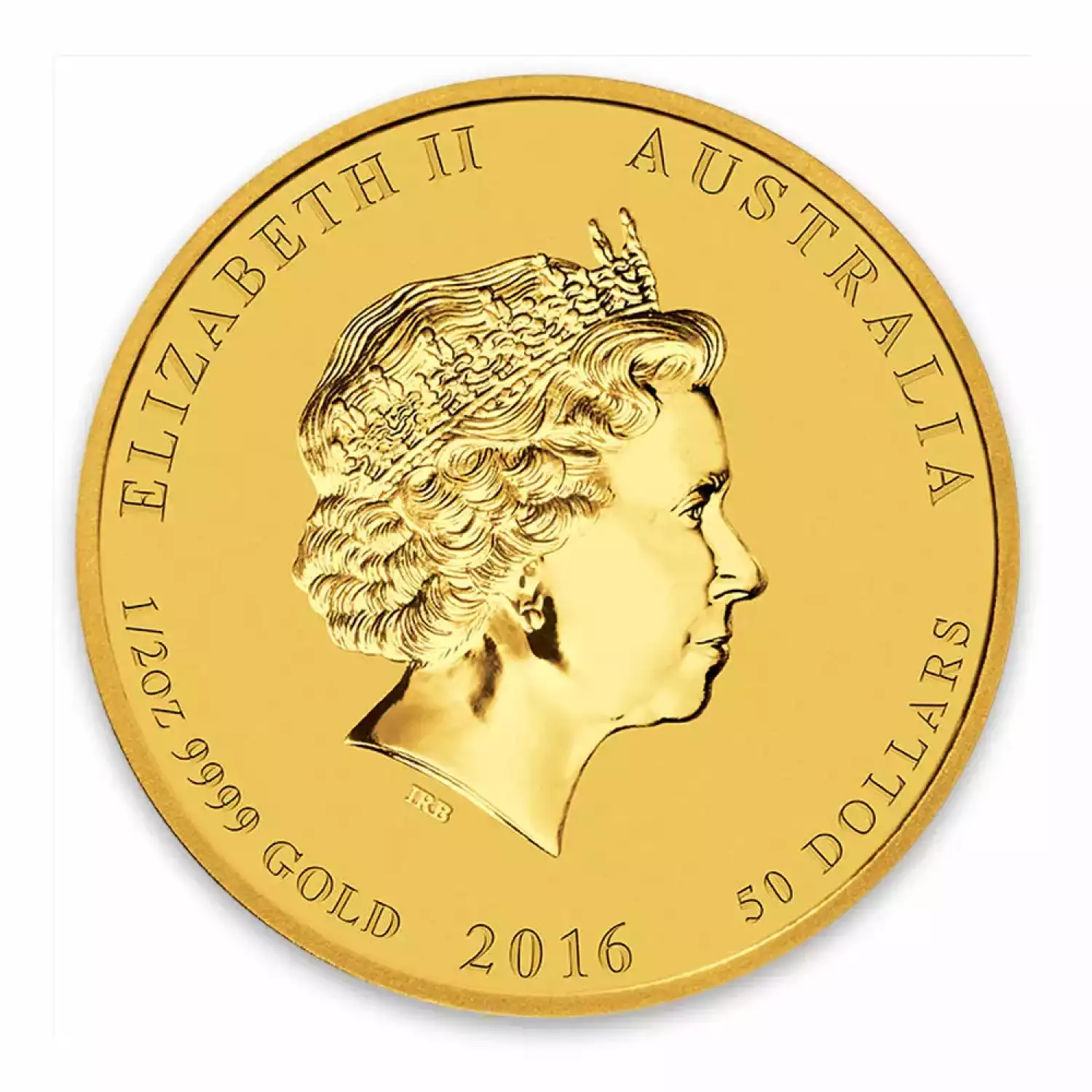 The 2016 ½ oz Australian Perth Mint Gold Lunar II: Year of the Monkey contains 1/10 troy oz of .9999 pure gold and has a face value of 50 AUD, backed by the government of Australia. The Obverse of the coin depicts the Ian Rank-Broadley likeness of Her Majesty Queen Elizabeth II. The Reverse of the coin depicts an adult monkey sitting on a branch of a peach tree.