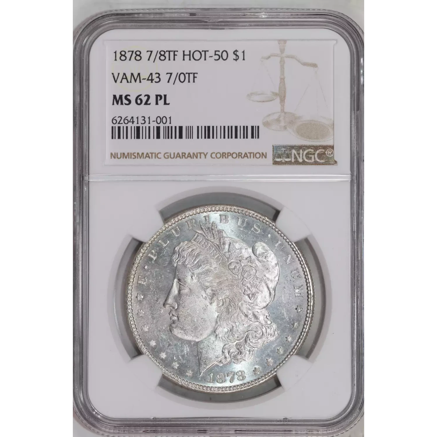 1878 7TF R78 VAM-43 "7/0 TF" HOT 50 MORGAN DOLLAR NGC MS62 PL