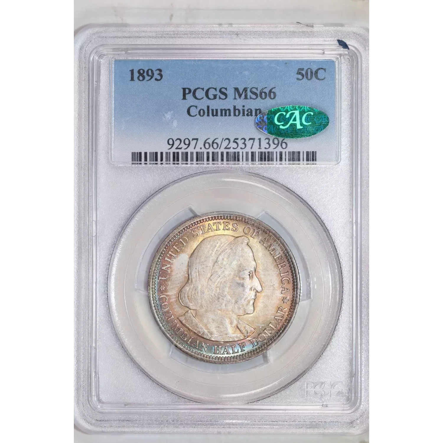 1893 COLUMBIAN SILVER COMMEMORATIVE HALF DOLLAR PCGS MS66 CAC RAINBOW TONING!