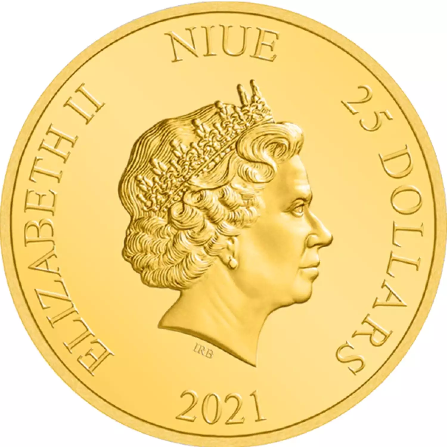 The coin arrives in a display-ready, quality coin case, which is placed inside a themed box showing the full-colour version of the coin image on the base. A Certificate of Authenticity is included showing the coin’s unique serial number and guaranteeing the pure quality of the gold.