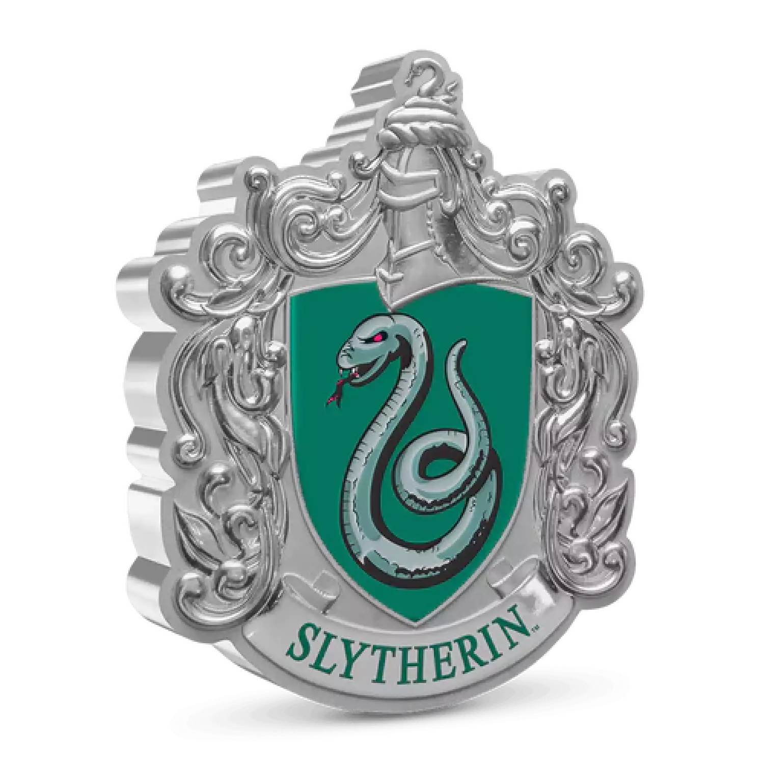Forming part of the Hogwarts™ House Crest Collection, this unique silver coin features a red-eyed snake on a large green shield – a serpent and the colour green being representative of this house. A scroll at the bottom is engraved with the name ‘Slytherin’ in green. For contrast, the intricately engraved surround has a mirrored and frosted finish.