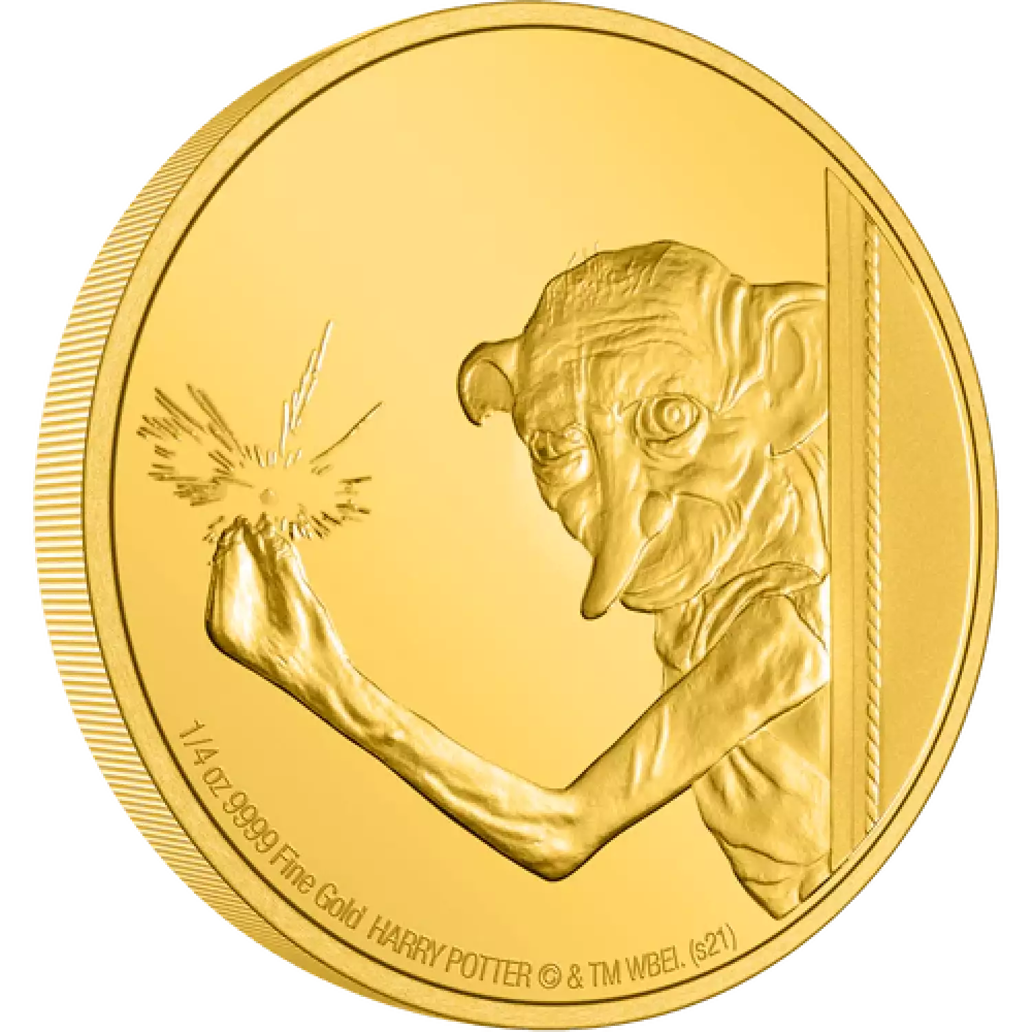 Loyal friend of Harry Potter, Dobby the House Elf is next to feature in our HARRY POTTER™ Classic Coin Collection. This beautifully engraved 1/4 oz gold coin shows Dobby using his magic to apparate in Harry Potter and the Chamber of Secrets™. On the opposite side, you will find the effigy of Her Majesty Queen Elizabeth II, confirming the coin as legal tender.
