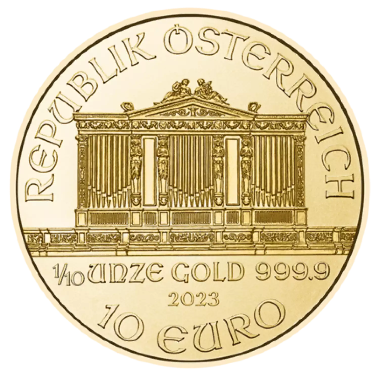 The 2023 1/10 oz Austrian Gold Philharmonic is a classically styled .9999 fine gold coin, backed by Austria. This series of gold coin is highly popular among investors and collectors. The 1/10 oz Austrian Gold Philharmonic coin contains 0.1 oz of gold. The Reverse of the 2023 1/10 oz Austrian gold coin features the stunning image of the Great Organ of the Golden Hall, Vienna Musikverein.