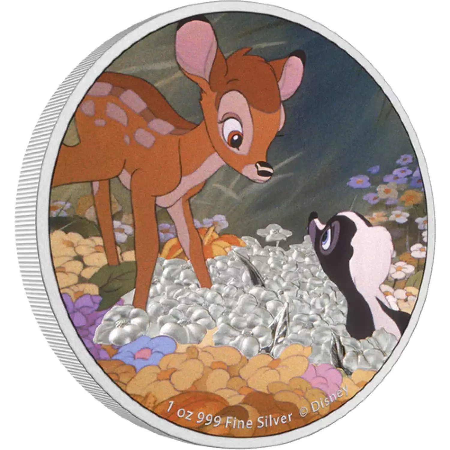 As part of our special Disney’s Bambi 80th anniversary collection, this beautiful 1oz pure silver coin features a coloured image of Bambi and Flower against the background of the forest. The patch of flowers between them has been frosted to accentuate the silver, with some flashes of mirror finish applied sporadically to further enrich the design.