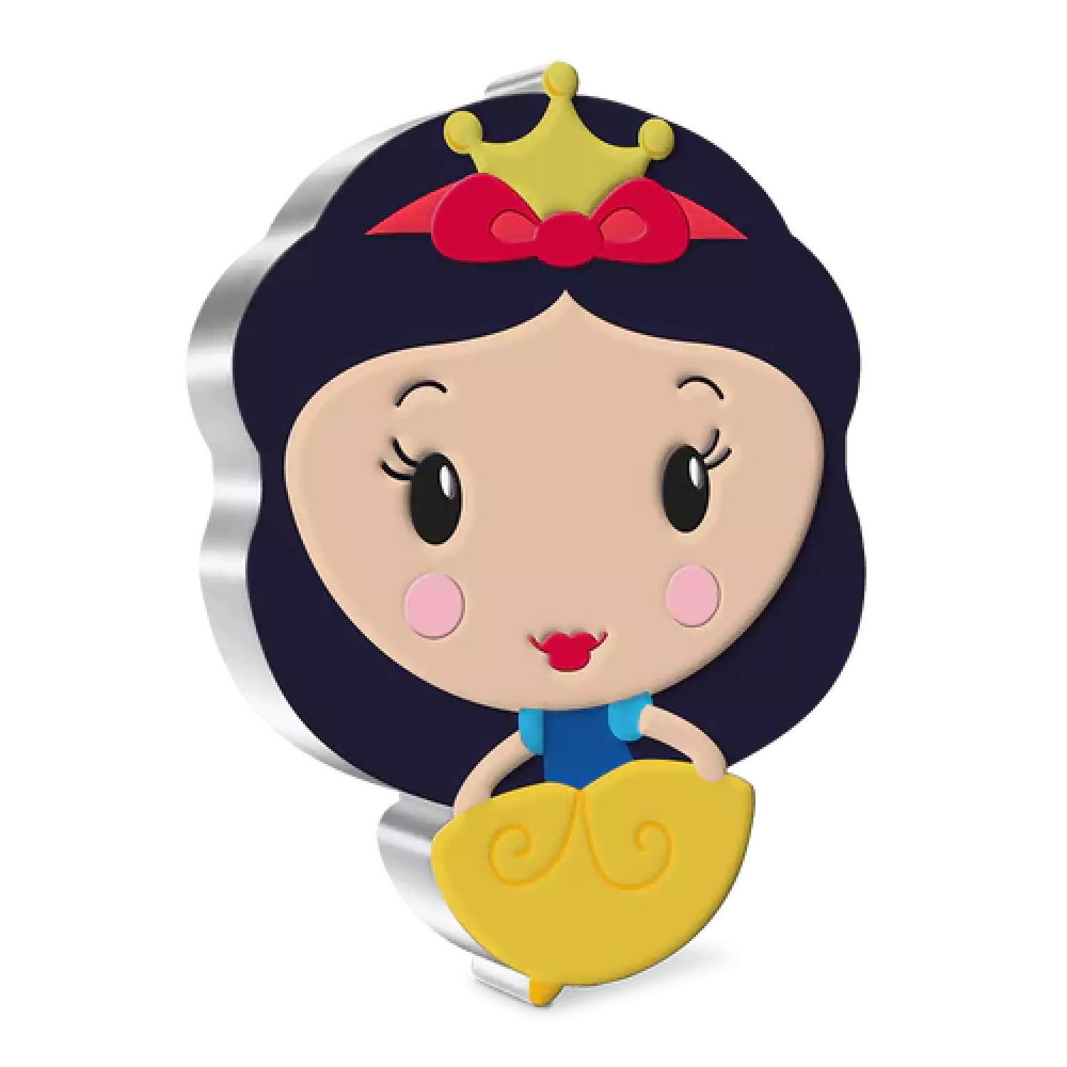 This 1oz pure silver Chibi® Coin has been shaped and coloured to represent Disney Princess Snow White. Recognisable by her red hair bow, lips as red as a rose and iconic blue and yellow dress. Despite the shape and colour of this coin, it is still legal tender, confirmed by the Ian Rank Broadley effigy of Her Majesty Queen Elizabeth II on the obverse. A specially designed coin case, moulded to the coin’s shape, offers extra protection to this limited-edition coin.
