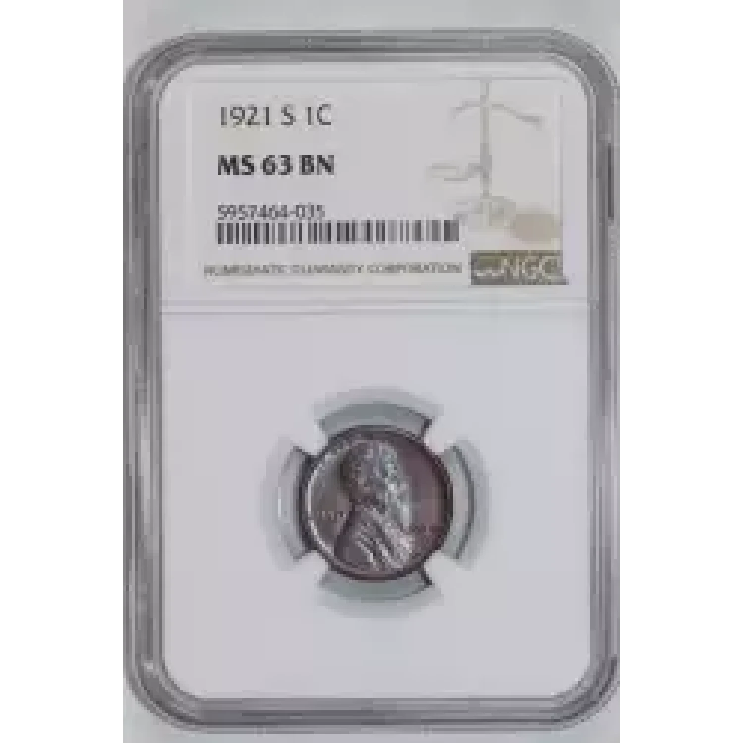 1921-S Small Cents Lincoln, Wheat Ears Reverse NGC MS-63 BN
