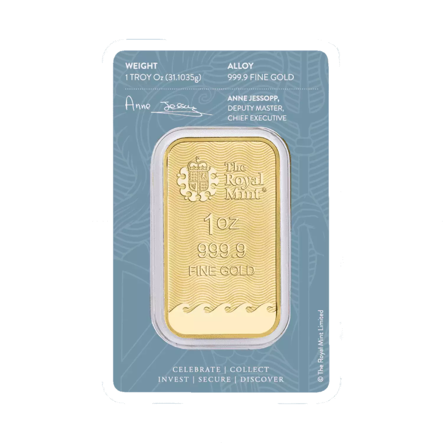 The Royal Mint is a popular mint in UK producing high-quality gold coins and gold bars. The 1 oz Royal Mint Britannia Minted Gold Bar contains 1 troy ounce of .9999 gold, ideal for those looking to build an easily divisible portfolio while furthering the beautiful designs that the Royal Mint is known for.
