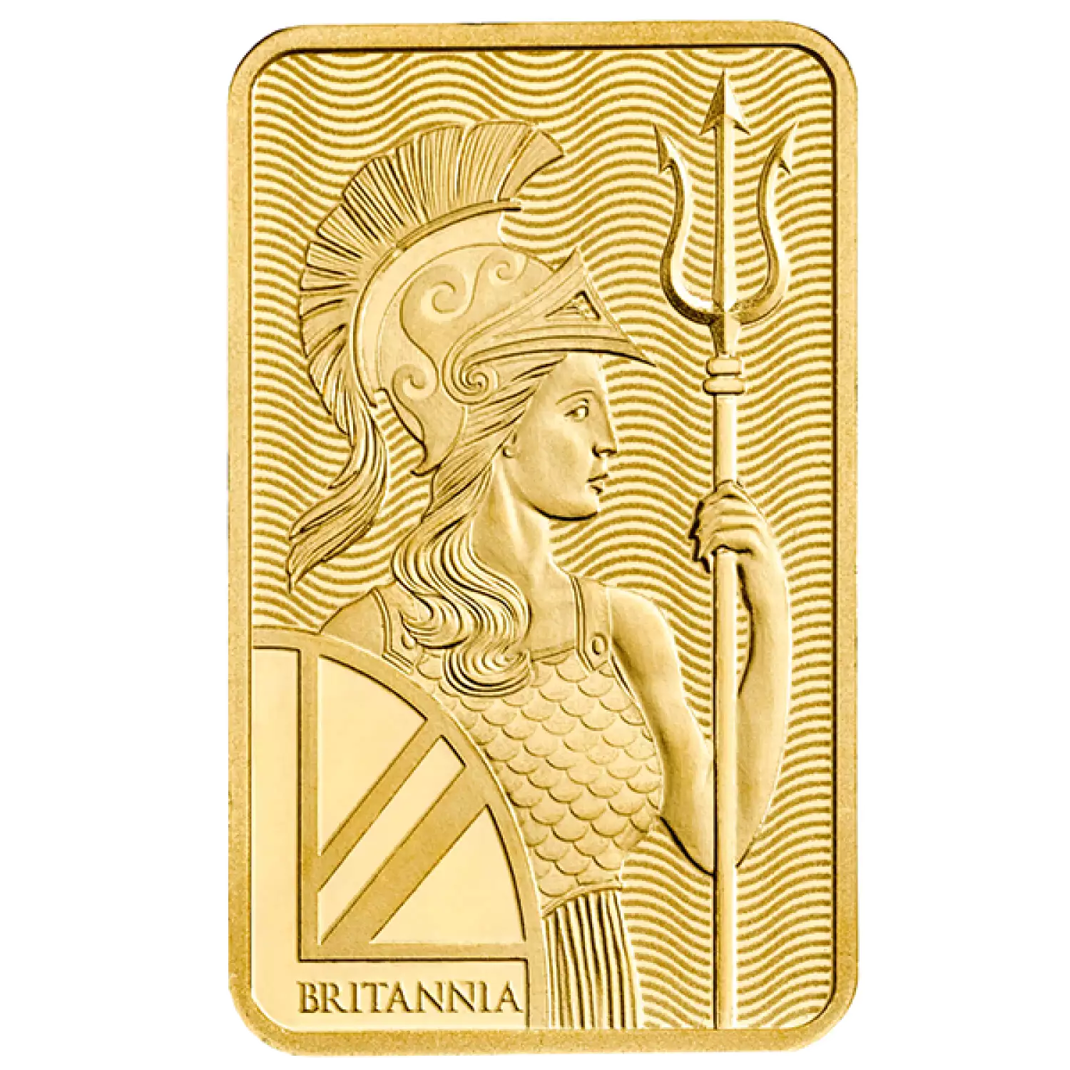 The 5 gram Gold Britannia Bar from the Royal Mint features the iconic Britannia design, which has been a symbol of British strength and integrity for centuries. The front of the bar depicts a detailed image of Britannia, the female personification of Great Britain, standing proud with her trident and shield. The reverse side features the Royal Mint’s famous bullion logo, weight, fineness, and unique serial number.