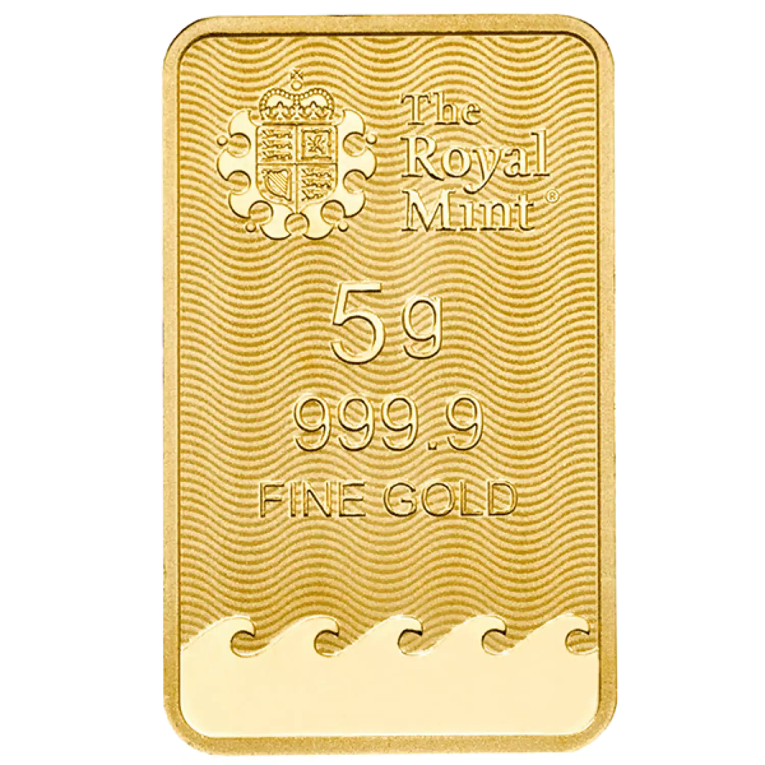 The 5 gram Gold Britannia Bar from the Royal Mint is made from 99.99% pure gold and has a weight of 5 grams or 0.1607 troy ounces. It measures 15mm x 8.5mm x 0.83mm, which makes it a compact and convenient way to own gold. Each bar comes with a unique serial number and is presented in a protective plastic sleeve to preserve its condition.