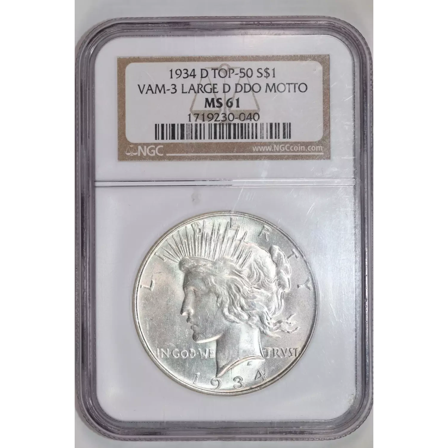 1934-D VAM-3 "LARGE D, DDO MOTTO" TOP 50 PEACE DOLLAR NGC MS61