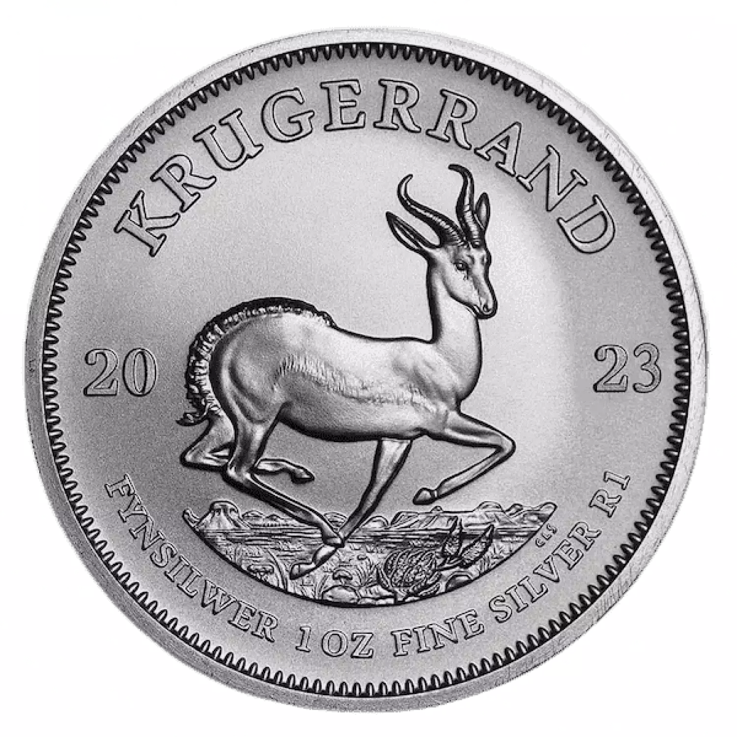 2023 South Africa 1oz Silver Krugerrand. This Brilliant Uncirculated coin has become widely popular among investors and collectors. The Silver Krugerrand has the same design as the beloved Gold Krugerrand coin. This well-known design has stayed the same since it was first introduced in 1967. The obverse shows the South African Republic's first president, Paul Kruger, while the reverse features a springbok, the national animal, as well as the date of minting.