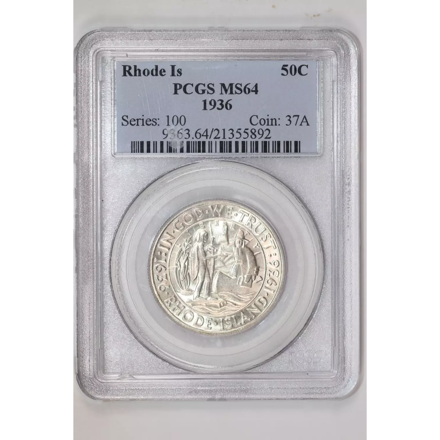1936 RHODE ISLAND SILVER COMMEMORATIVE HALF DOLLAR PCGS MS64