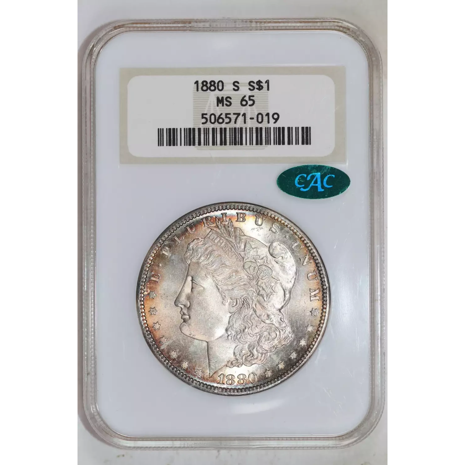 1880-S MORGAN DOLLAR NGC MS65 CAC OLD FATTY HOLDER! RAINBOW!
