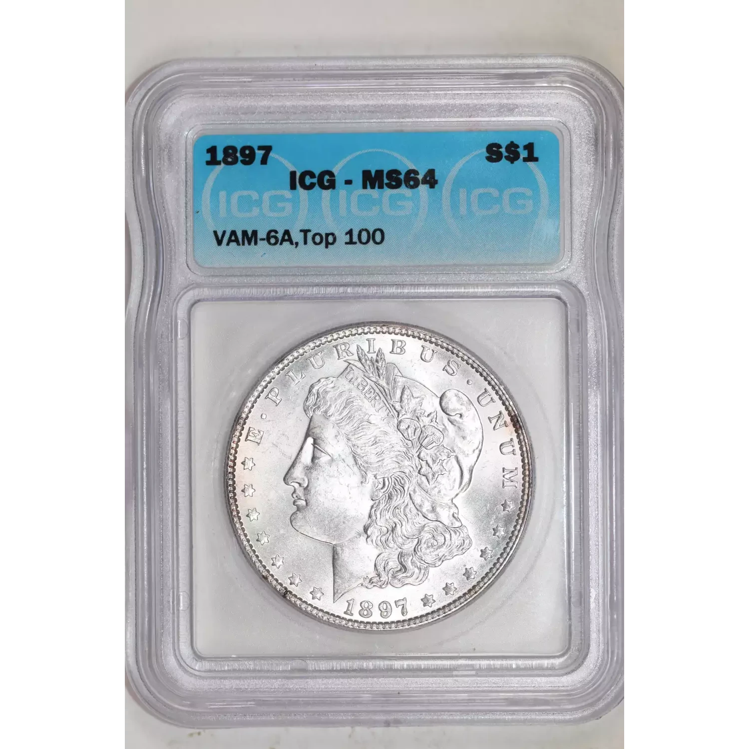 1897 VAM-6A PITTED REVERSE TOP 100 MORGAN DOLLAR ICG MS64