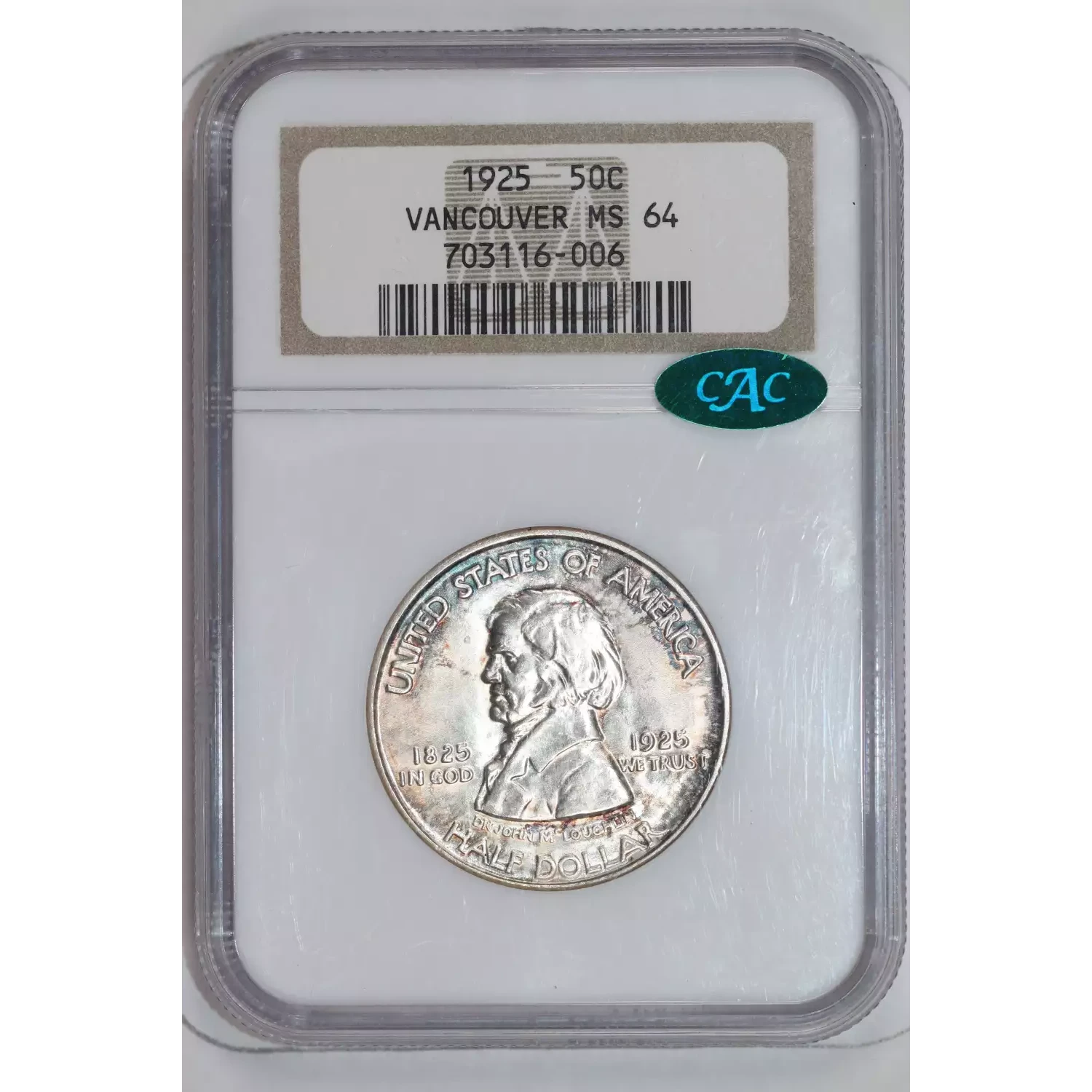 1925 VANCOUVER SILVER COMMEMORATIVE HALF DOLLAR NGC MS64 - VERY PQ CAC!