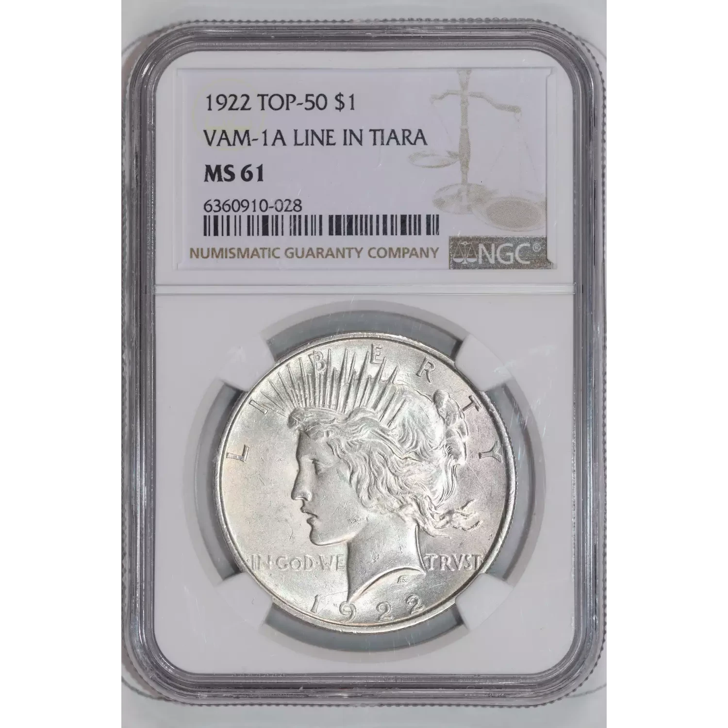 1922 VAM-1A "LINE IN TIARA" TOP 50 PEACE DOLLAR NGC MS61