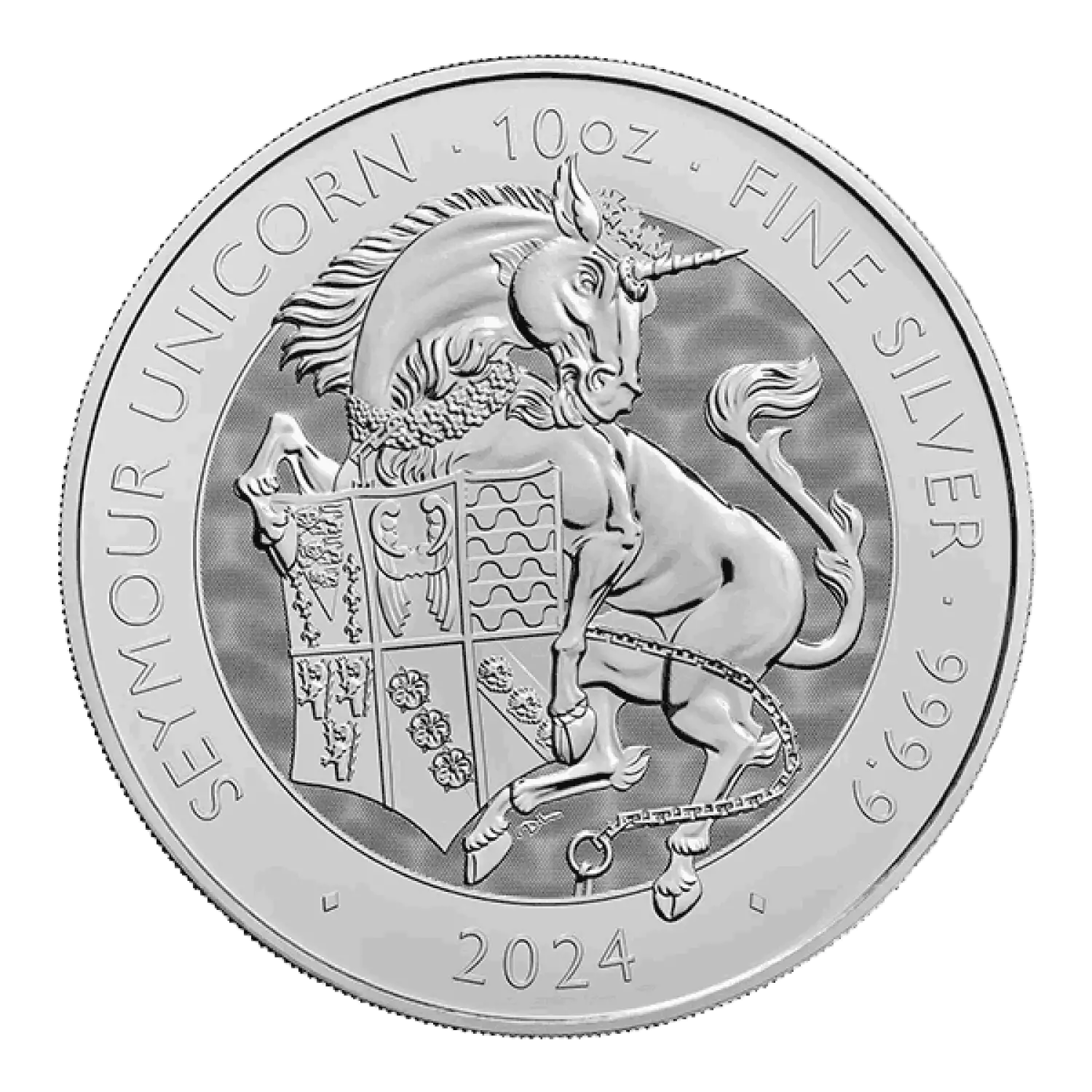 If you're in search of a substantial silver coin boasting high purity for investment purposes, your quest ends with the 2024 10 oz British Silver Tudor Beasts Seymour Unicorn Coin. This coin encompasses an impressive 10 Troy oz of .9999 silver, representing the largest size available within the renowned Tudor Beasts Series. The Seymour Unicorn, originally gifted to Jane Seymour, can now grace your collection. Secure yours today at JM Bullion.