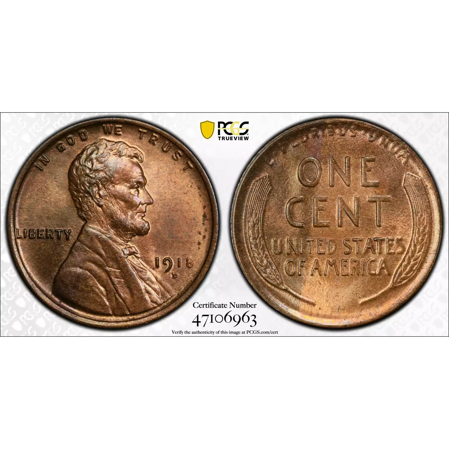 1918-D Small Cents Lincoln, Wheat Ears Reverse PCGS MS-64 RB