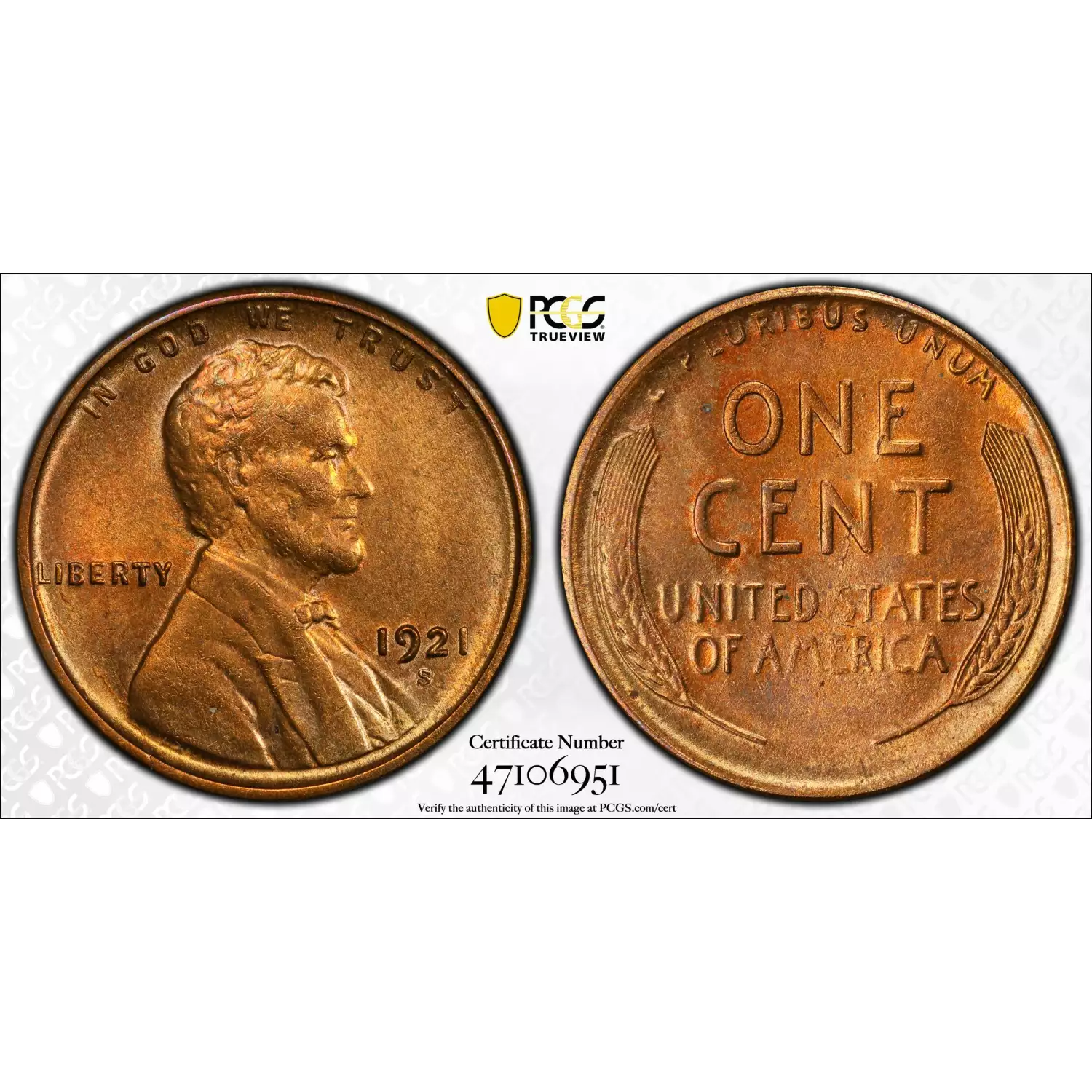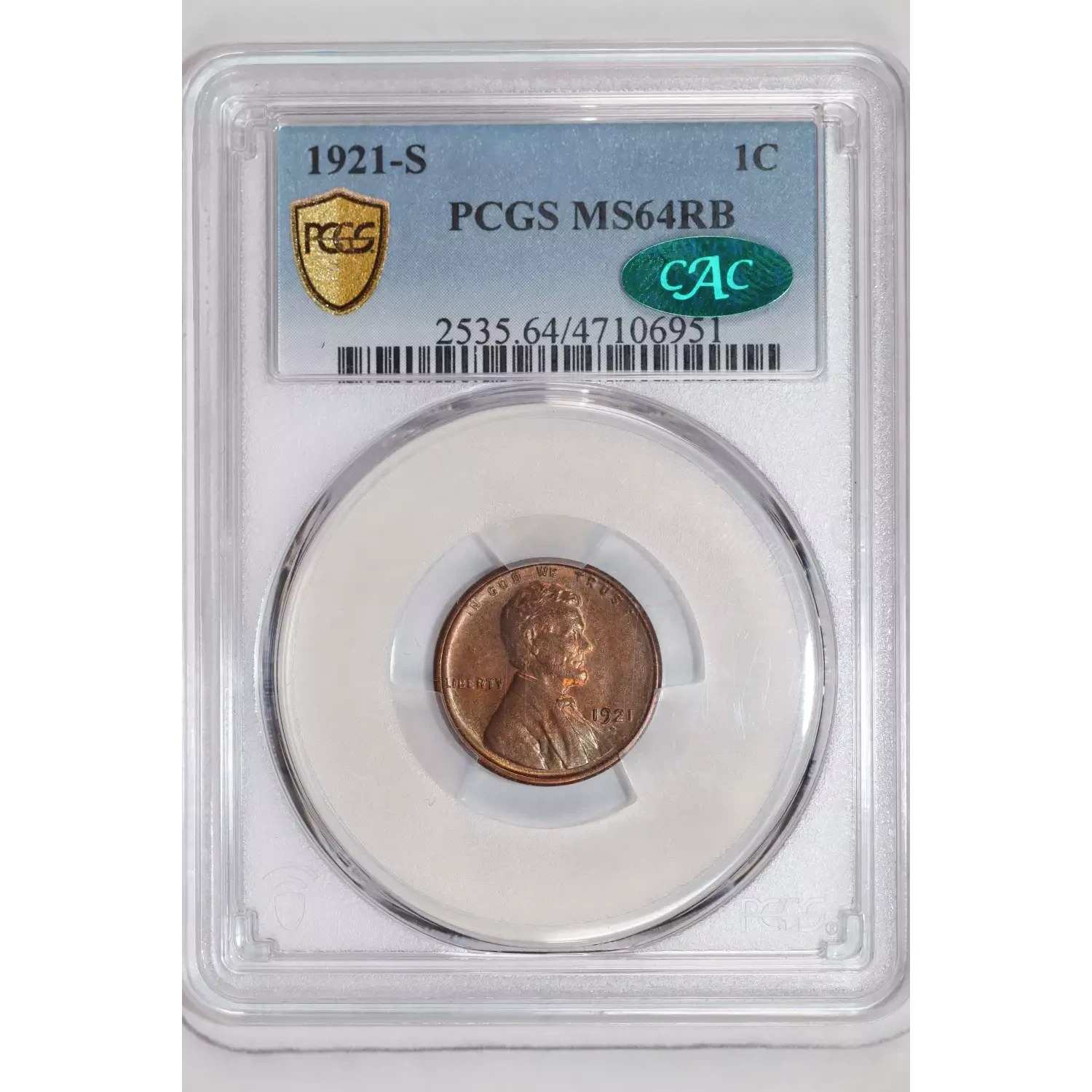 1921-S Small Cents Lincoln, Wheat Ears Reverse PCGS MS-64 RB CAC