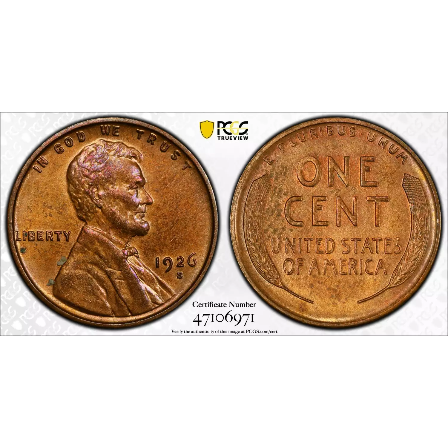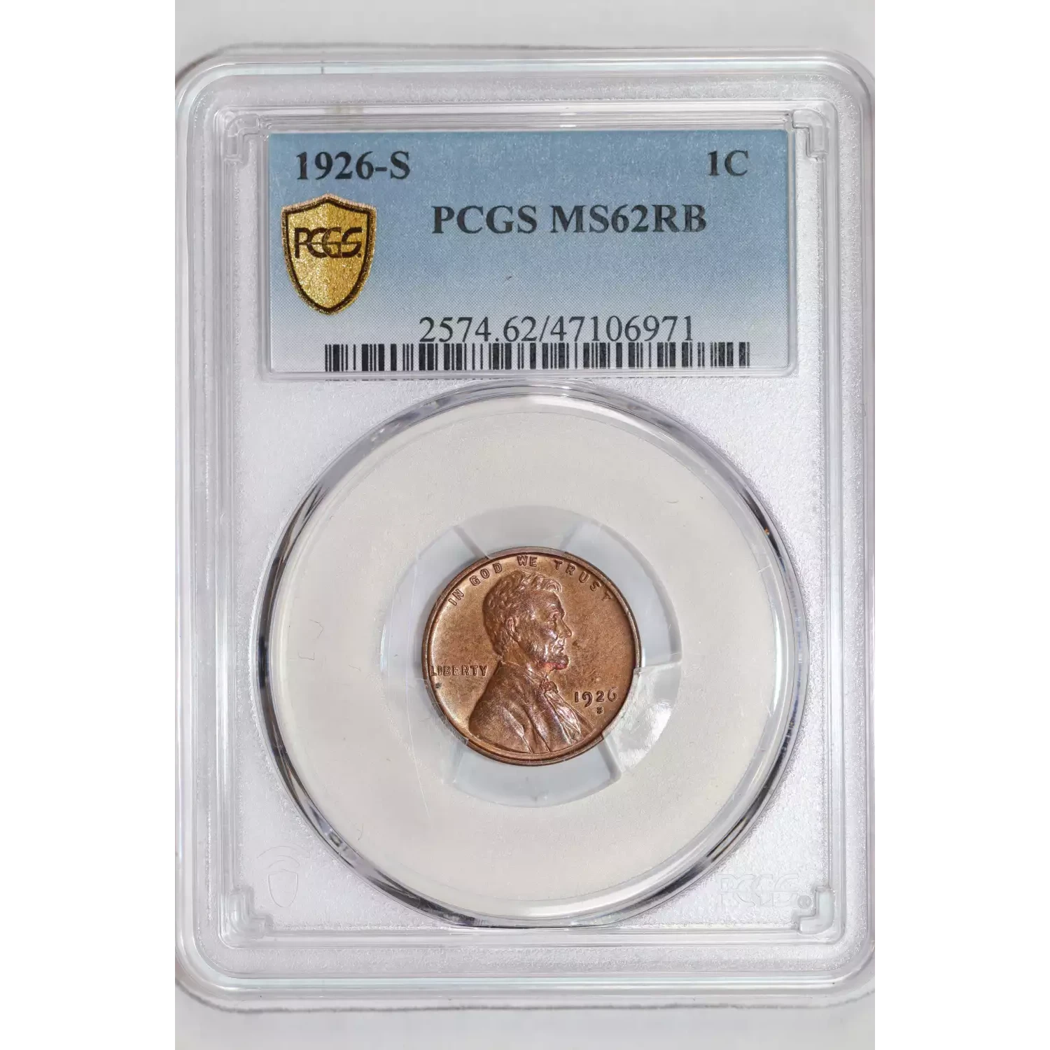 1926-S Small Cents Lincoln, Wheat Ears Reverse PCGS MS-62 RB