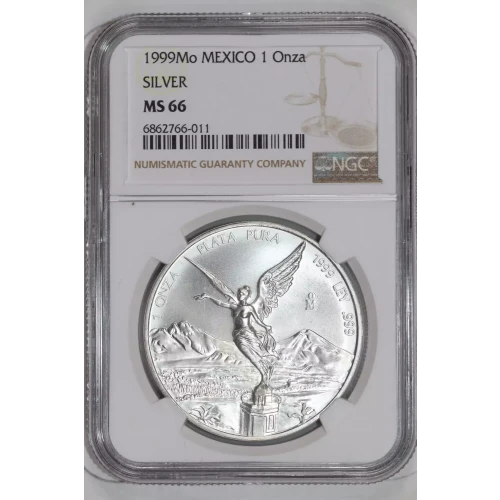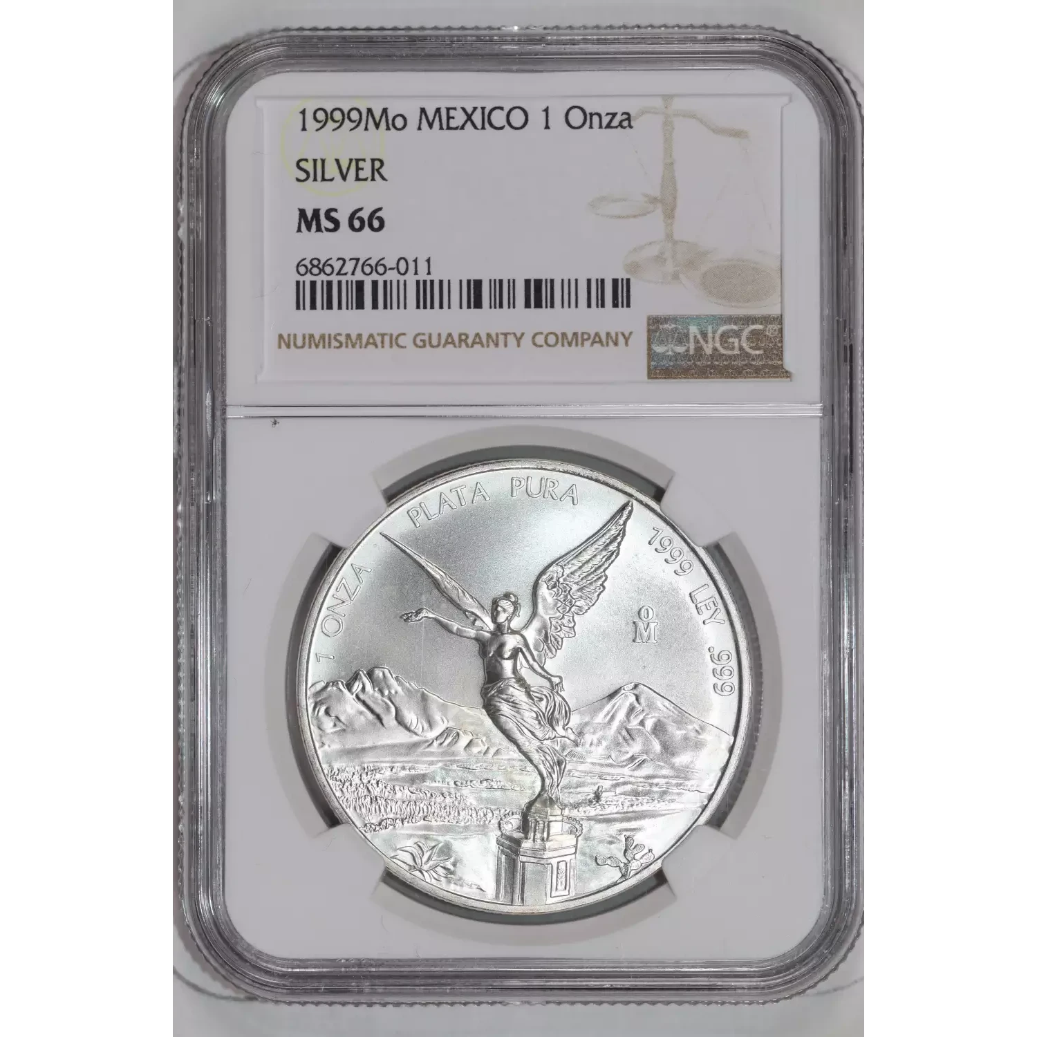 1999 MEXICO Silver ONZA (Troy Ounce of Silver) NGC MS-66 Mo SILVER