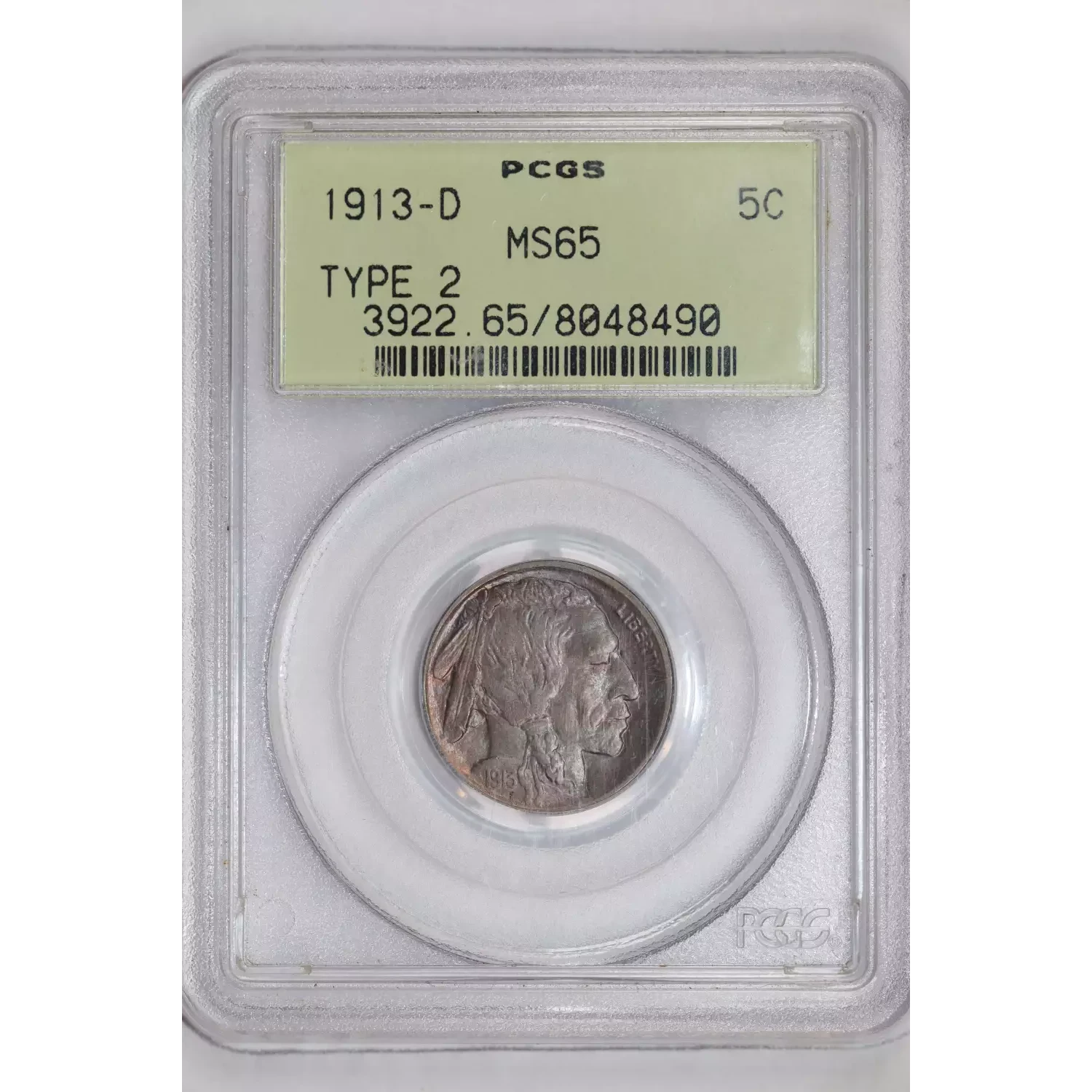1913-D TYPE 2 BUFFALO NICKEL PCGS MS65 OGH - PRETTY COLOR!