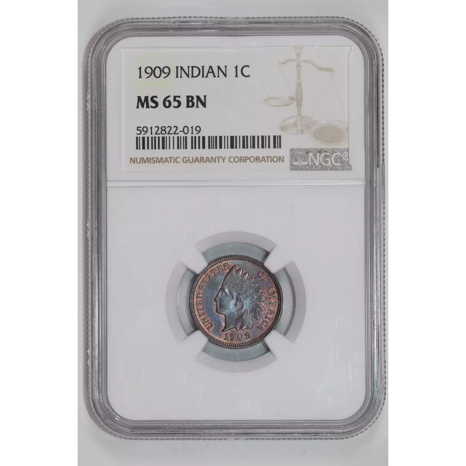 1909 INDIAN HEAD CENT NGC MS65 BN - PRETTY BLUE TONING!