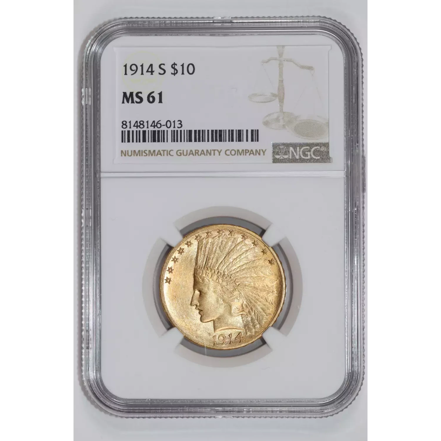 1914-S $10 GOLD INDIAN EAGLE NGC MS61