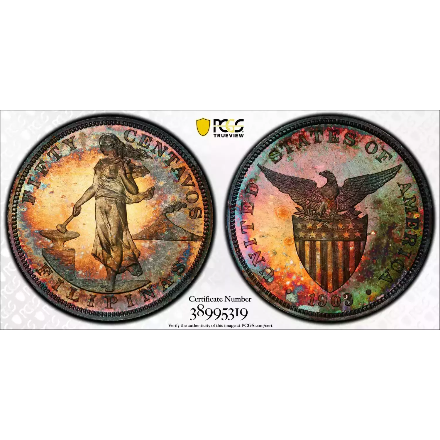 1903 PROOF 50 CENTAVOS US PHILIPPINES PCGS PR67 MONSTER RAINBOW TONED!