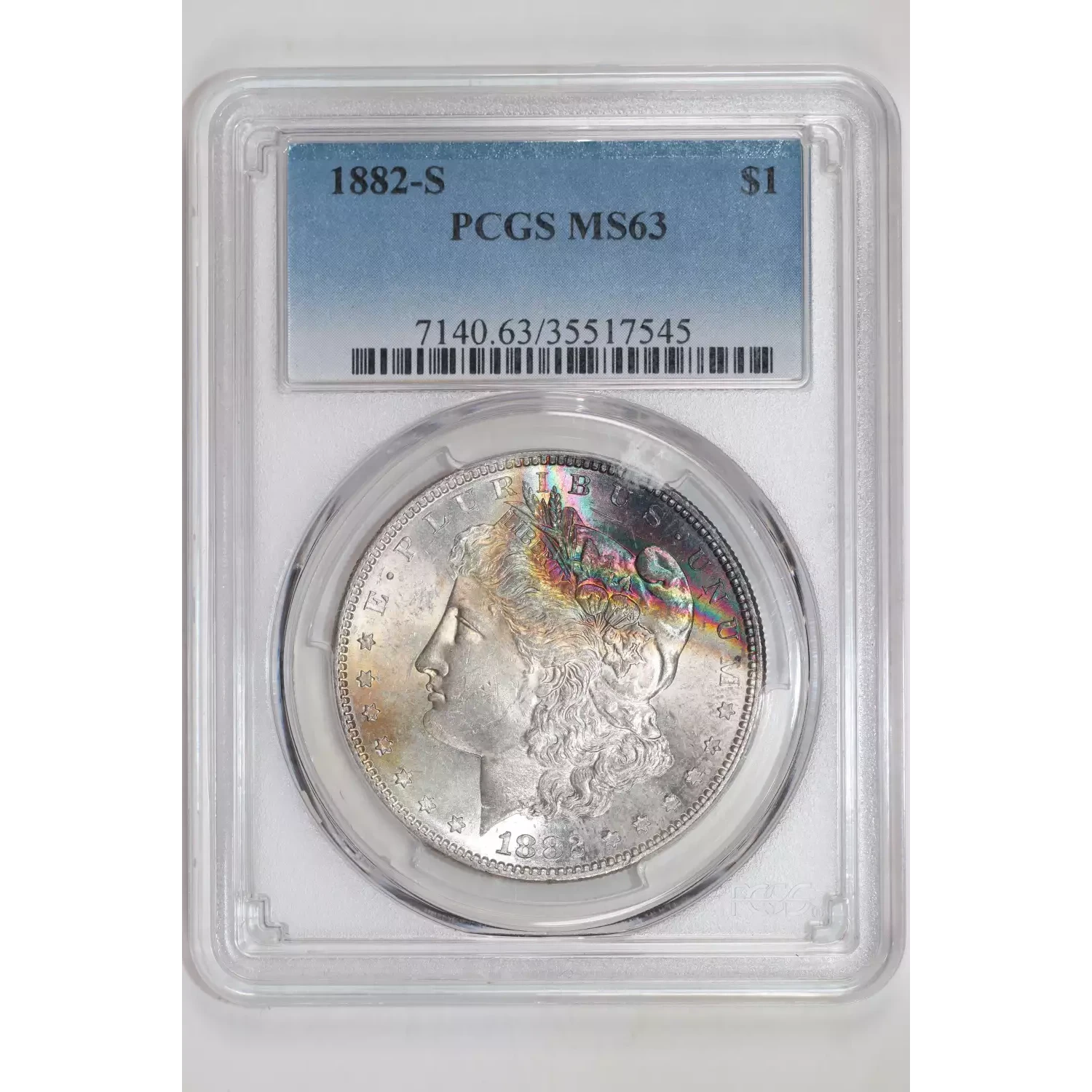 1882-S MORGAN DOLLAR PCGS MS63 VIBRANT RAINBOW TONING!