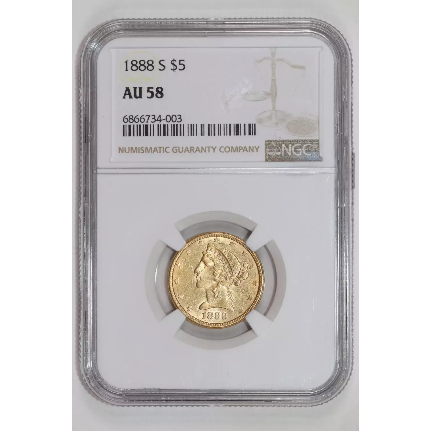 1888-S $5 GOLD LIBERTY HALF EAGLE NGC AU58