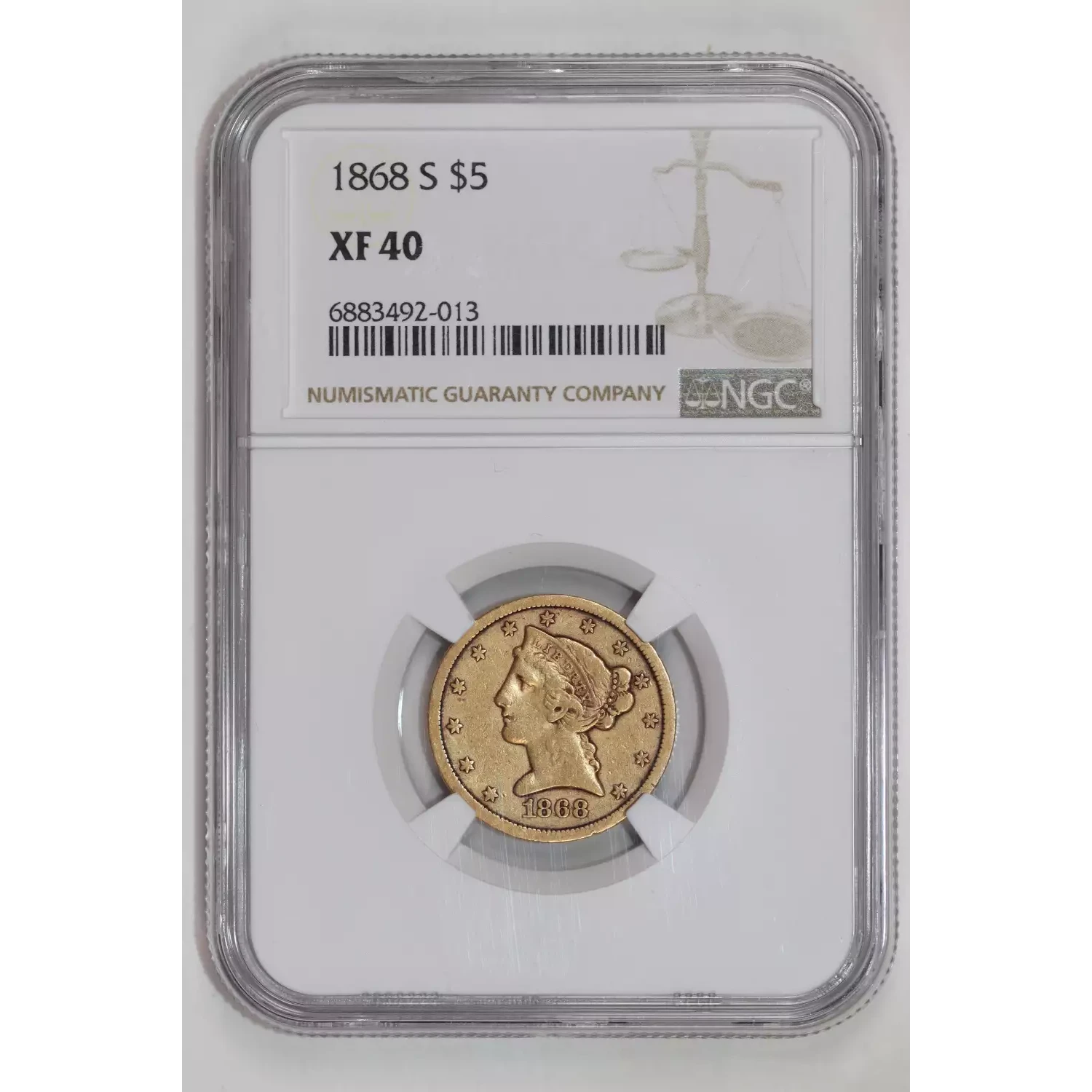 1868-S $5 GOLD LIBERTY HALF EAGLE NGC XF40 - ONLY 52,000 MINTED!