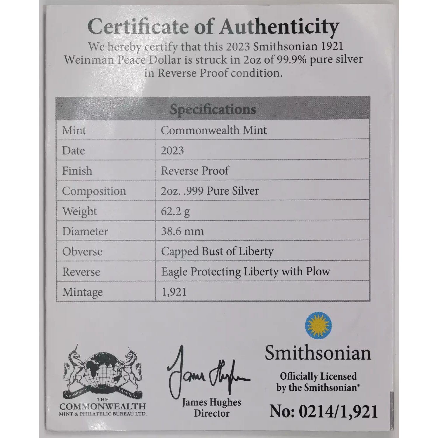 2023 2 OUNCE SILVER WEINMAN PEACE DOLLAR HIGH RELIEF NGC REVERSE PROOF 70 CLARK SIGNATURE