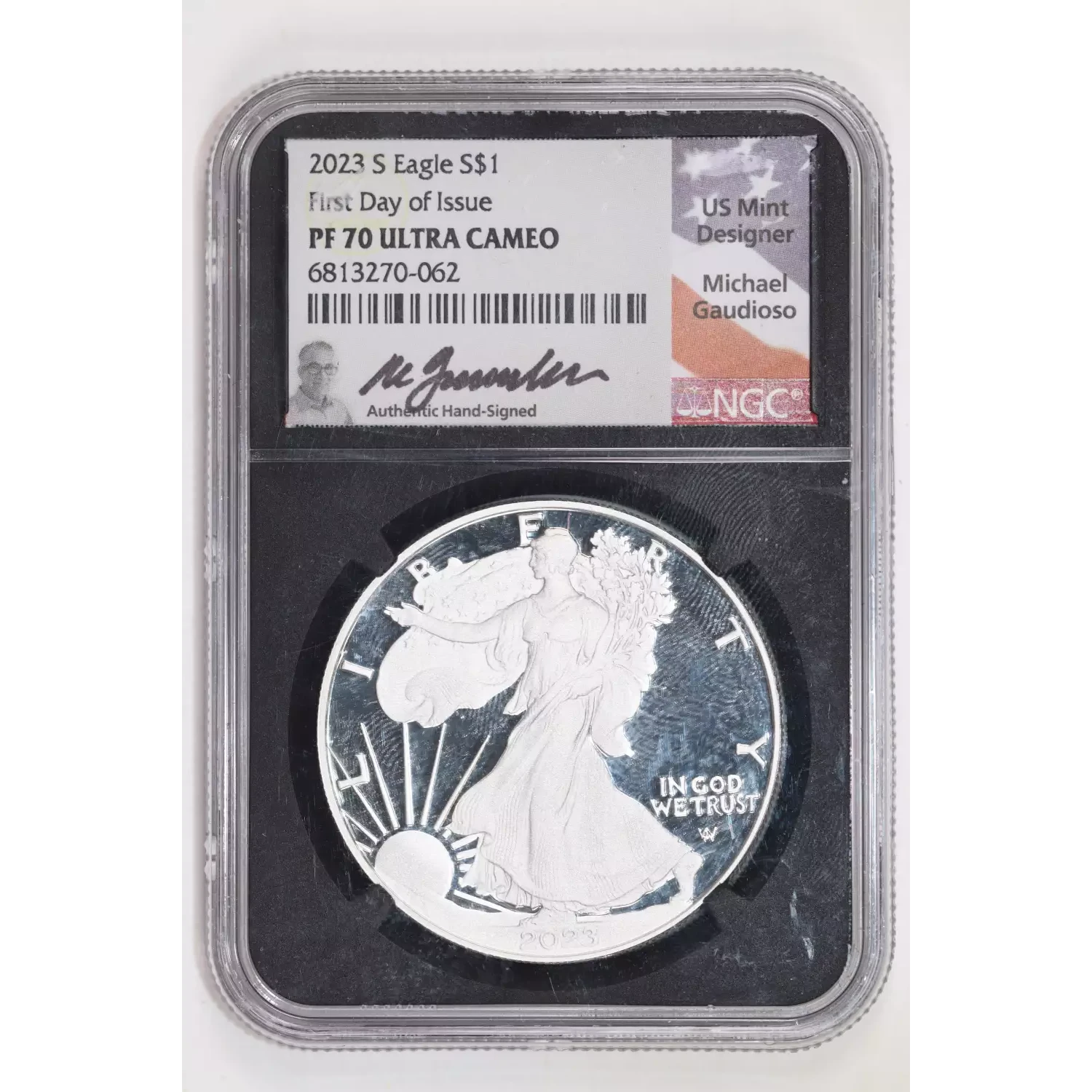 2023-S PROOF SILVER EAGLE NGC PR70 UCAM FDOI GAUDIOSO SIGNATURE