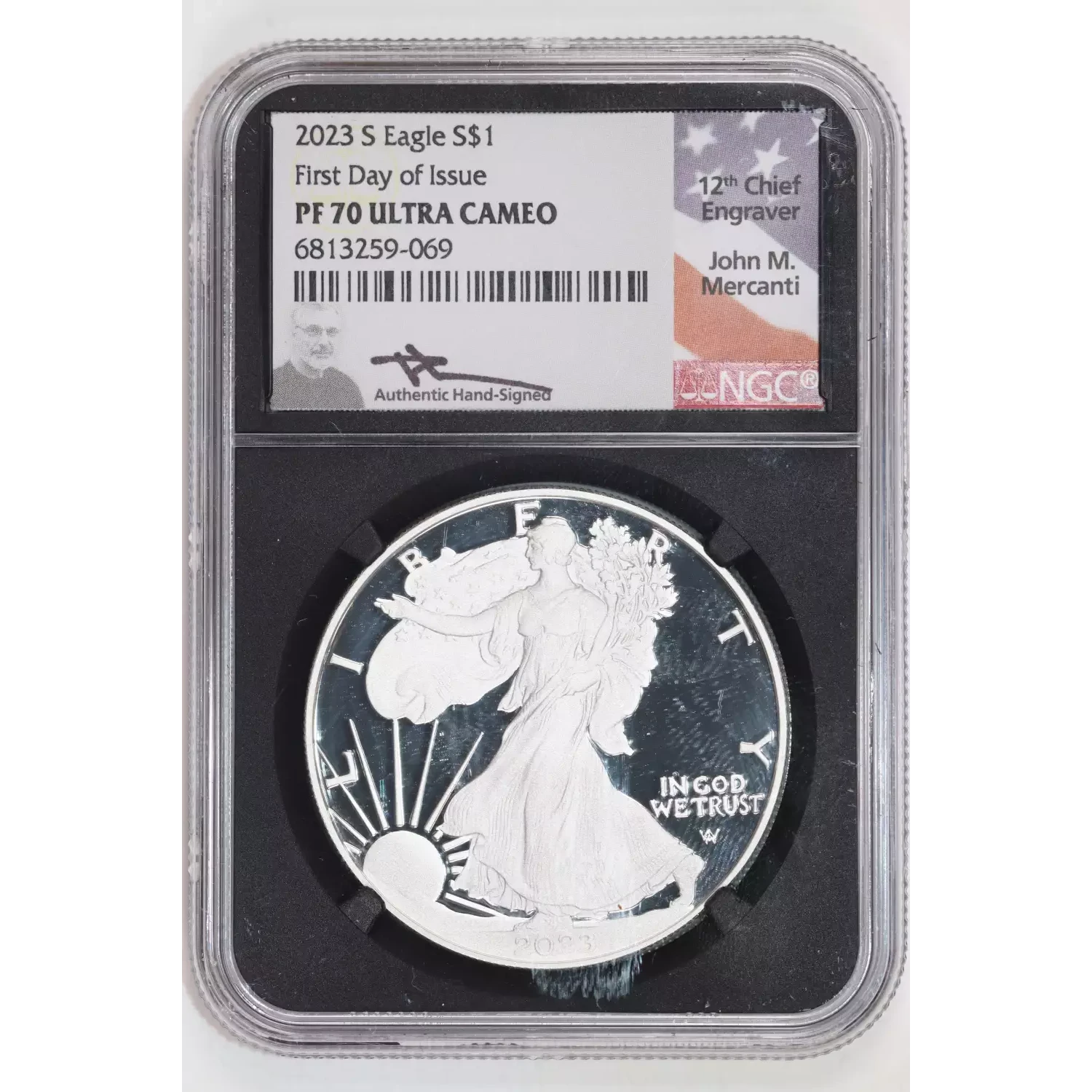 2023-S PROOF SILVER EAGLE NGC PR70 UCAM FDOI MERCANTI SIGNATURE