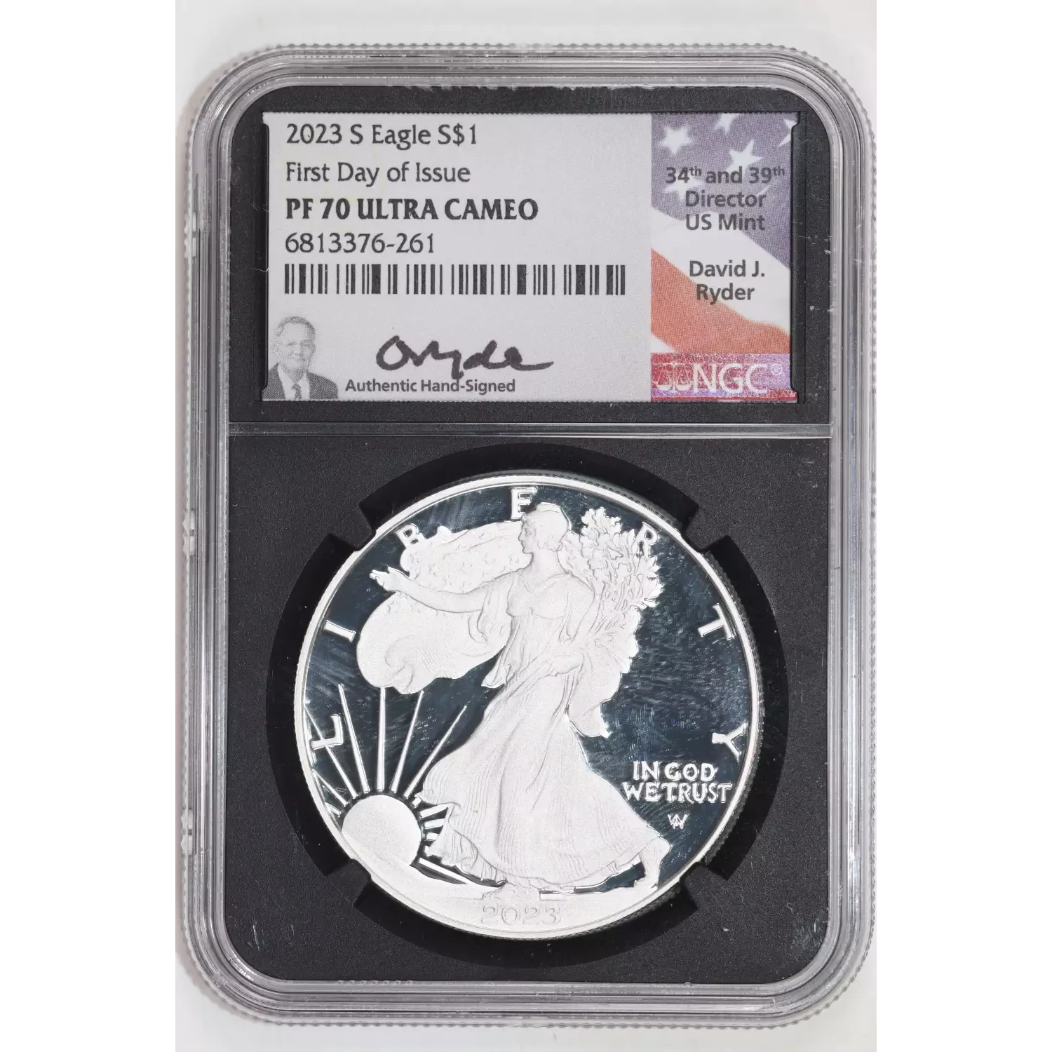 2023-S PROOF SILVER EAGLE NGC PR70 UCAM FDOI RYDER SIGNATURE