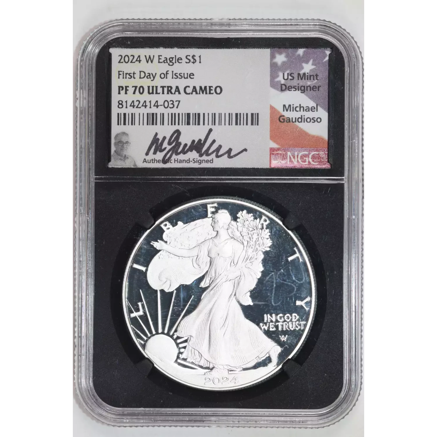 2024-W PROOF SILVER EAGLE NGC PR70 UCAM FDOI GAUDIOSO SIGNATURE