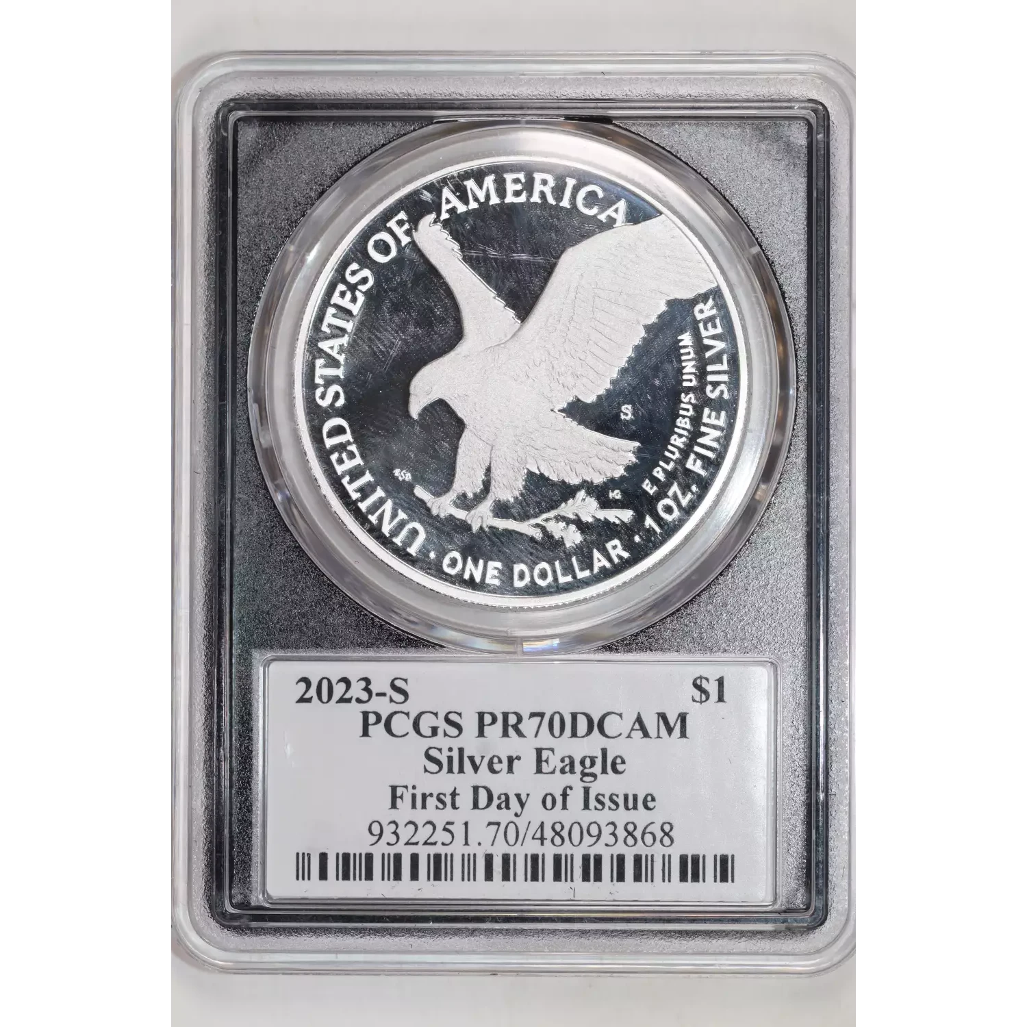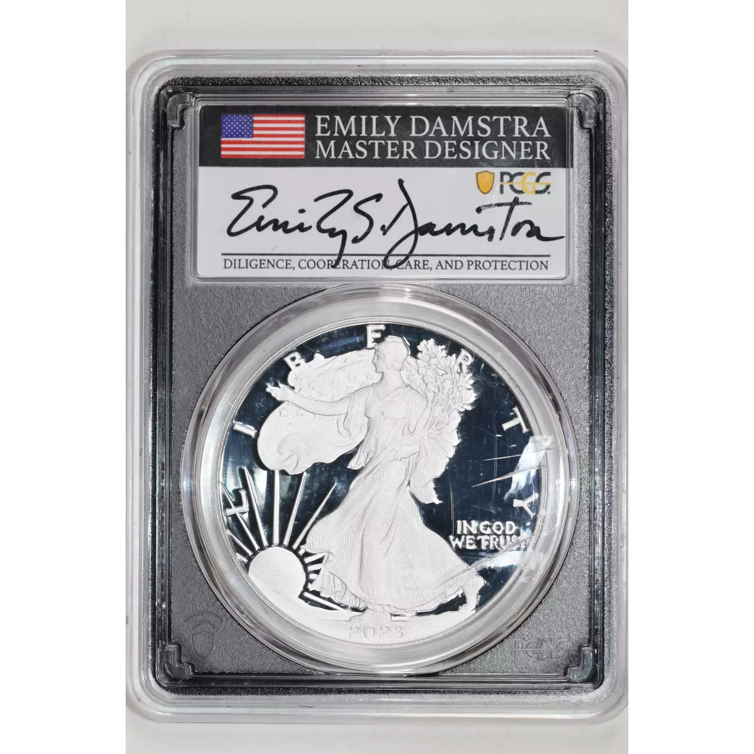 2023-S PROOF SILVER EAGLE PCGS PR70 DCAM FDOI DAMSTRA SIGNATURE