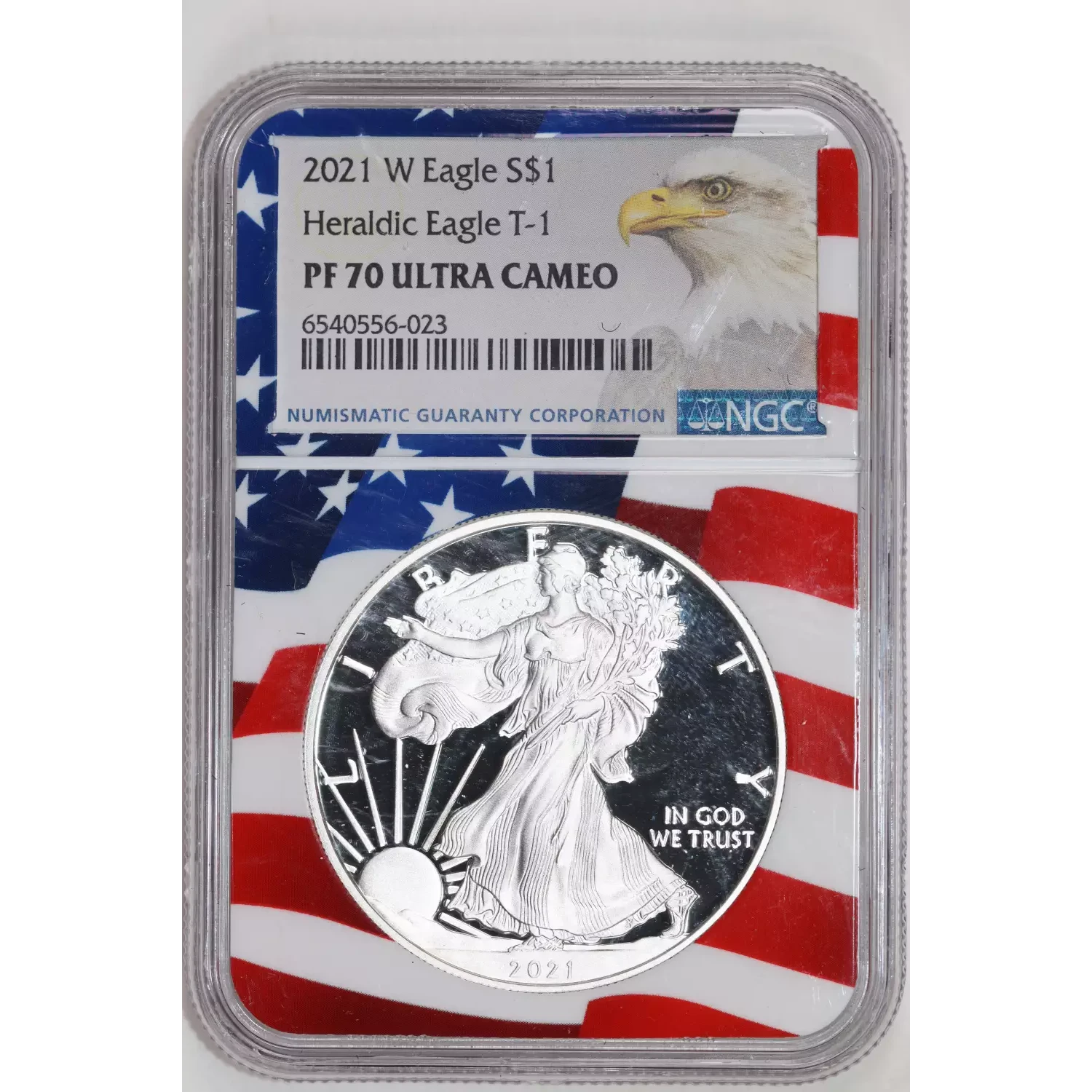 2021-W PROOF SILVER EAGLE HERALDIC TYPE 1 NGC PR70 UCAM FLAG LABEL