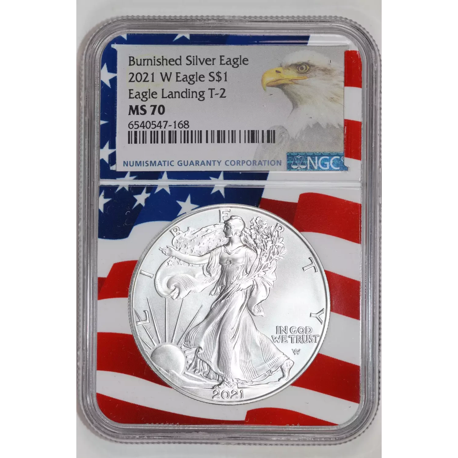 2021-W BURNISHED TYPE 2 LANDING SILVER EAGLE NGC MS70 FLAG LABEL