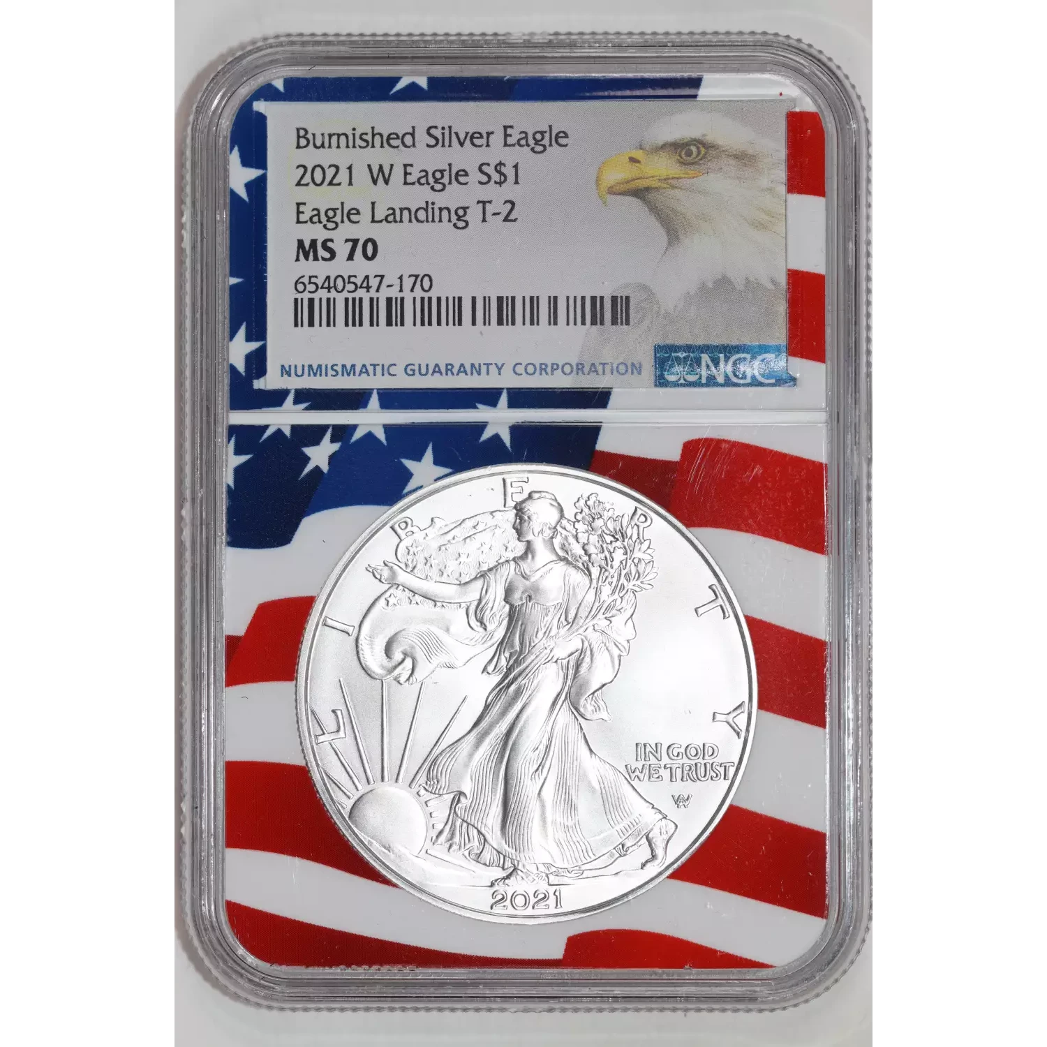 2021-W BURNISHED TYPE 2 LANDING SILVER EAGLE NGC MS70 FLAG LABEL
