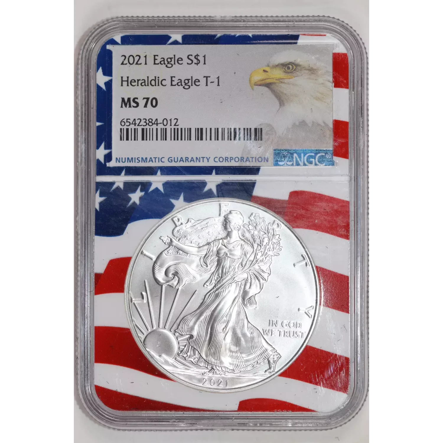 2021 SILVER EAGLE TYPE 1 HERALDIC NGC MS70 FLAG LABEL