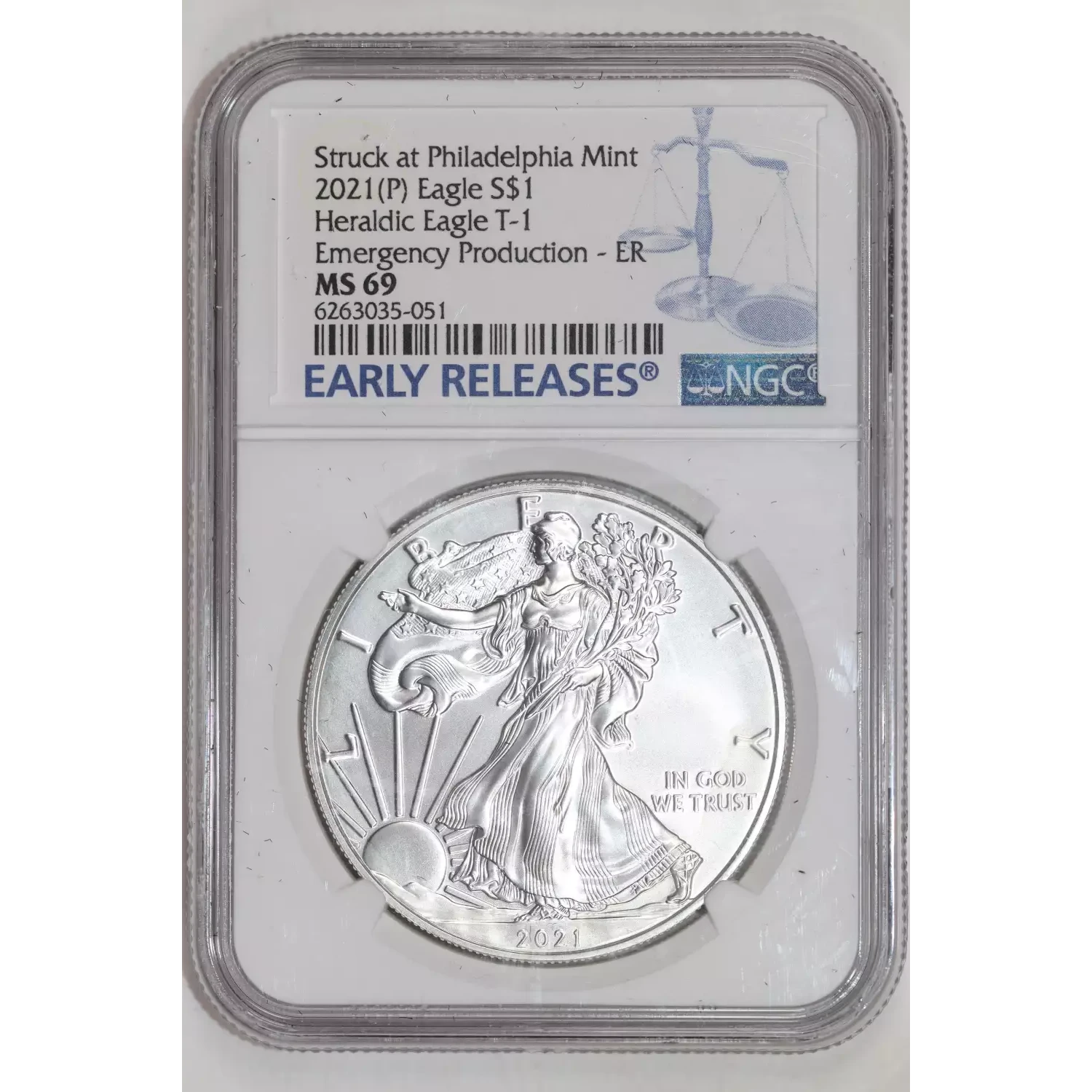 2021 (P) SILVER HERALDIC EAGLE TYPE 1 NGC MS69 EMERGENCY STRUCK AT PHILADELPHIA MINT